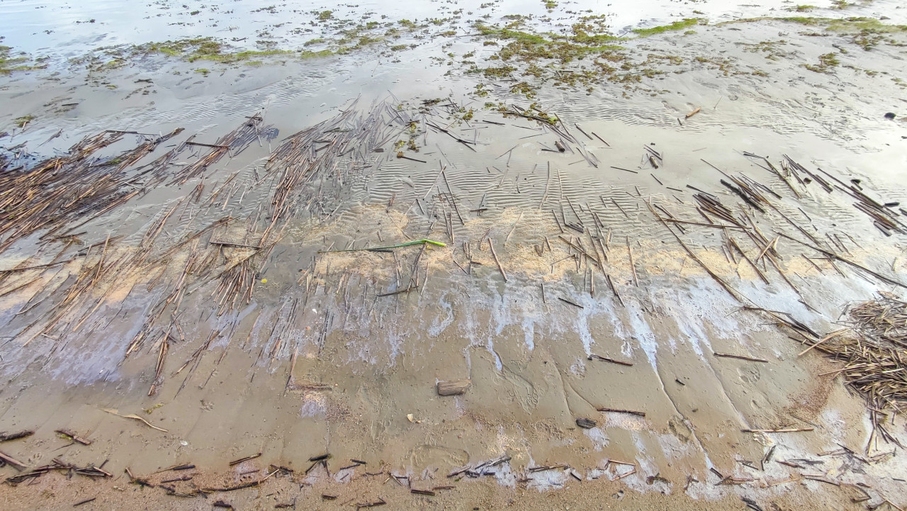 Кадр снят сверху и показывает фактуру прибрежной полосы: мокрый песок и ил с параллельными рябинами, тонкие потоки воды и светлые полосы осадка. По поверхности разбросаны тростниковые стебли разной длины, отдельные веточки и небольшие фрагменты мусора, ближе к воде видны пятна зелёных водорослей. Цветовая гамма нейтральная, освещение рассеянное, летний день. Такой снимок подходит как текстурный фон для дизайна, а также для материалов о береговых процессах, мелководье, замусоривании природных территорий и наблюдениях за состоянием водоёма.