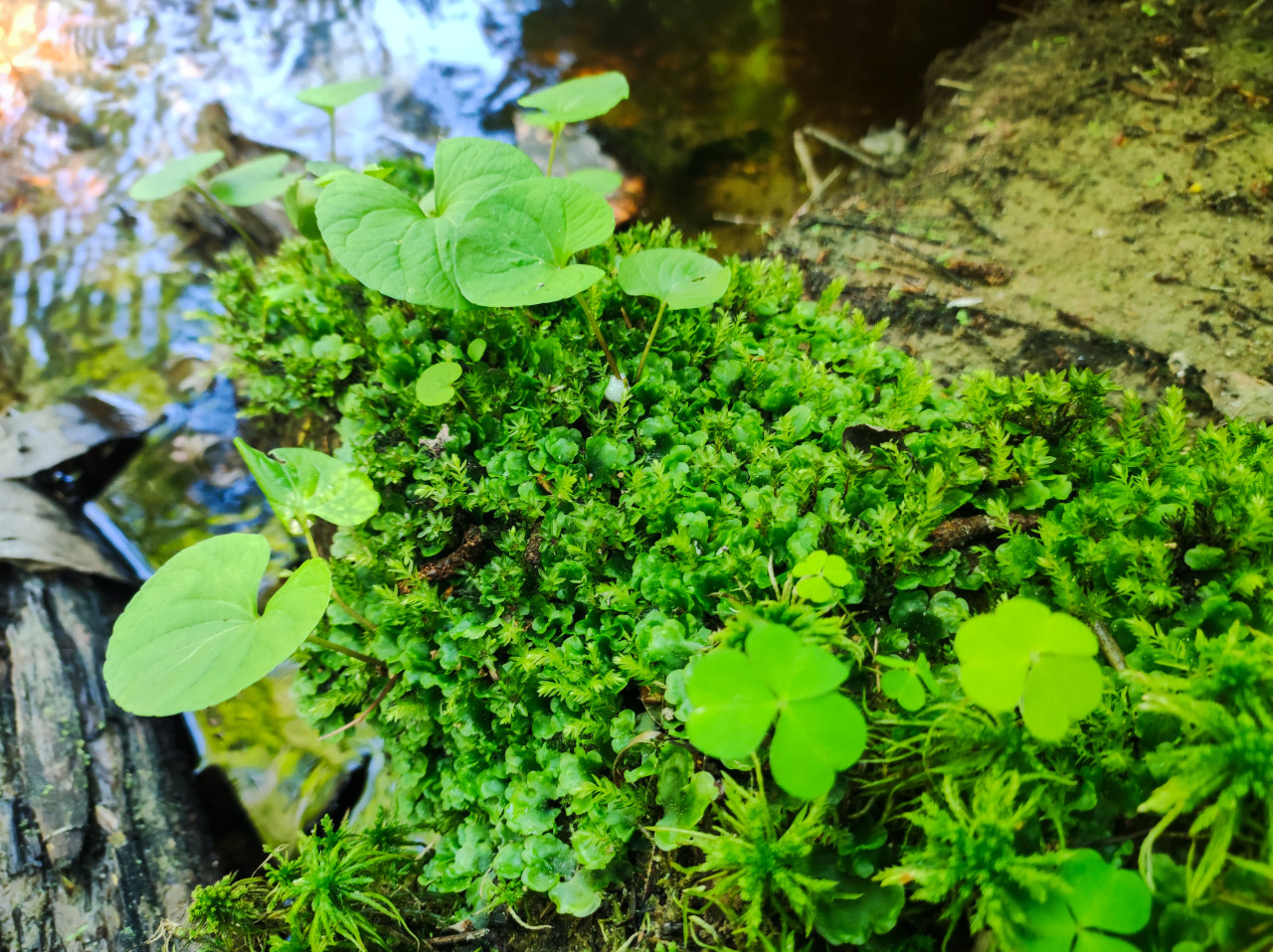 Крупный план лесного валежника: на коре лежит плотная подушка ярко-зеленого мха, среди которого видны мелкие стебли и круглые листья молодых растений. По краям кадра заметны древесные волокна и влажные участки коры, создающие контраст фактур. Съёмка выполнена в природной среде при рассеянном дневном свете, характерном для летнего леса. Фотографию можно использовать в учебных материалах по ботанике и экологии, в статьях о лесной подстилке и биоразнообразии, а также как натуральный фон для сайтов, презентаций и полиграфии.