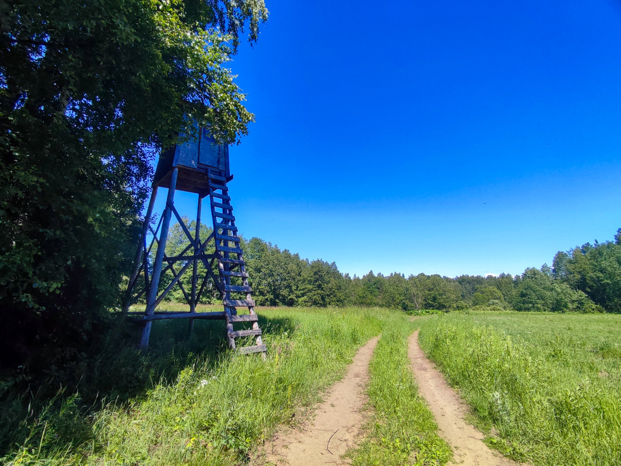 Лесная опушка и полевая дорога с двойной колеёй: тропа уходит в зелёный луг, а слева под деревьями стоит высокая деревянная вышка с лестницей, предназначенная для наблюдения. На горизонте видна полоса леса, небо ярко-синее без заметной дымки, освещение дневное, летнее. Кадр передаёт атмосферу сельской местности и природного хозяйства. Фотография подойдёт для публикаций об охотничьих угодьях, маршрутах прогулок, экологическом туризме и ориентировании, а также для материалов о безопасности и инфраструктуре на природных территориях.
