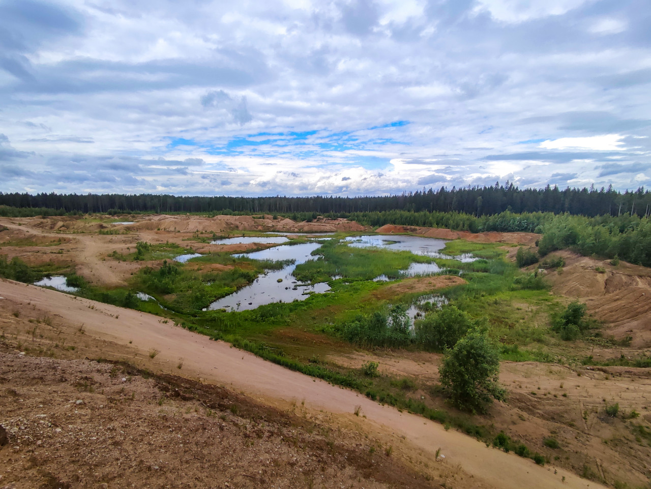 природа открытый воздух естественная среда природная зона природный ландшафт пейзаж ландшафтная фотография растительность лес деревья небо панорама облачное небо лесной массив линия горизонта песок песчаная выработка карьер песчаные холмы склоны грунт колея водоёмы затопление заболоченные участки прибрежная растительность зелёные заросли камыши протоки мелководье отражение неба техногенный рельеф рекультивация экосистема природный парк экологический мониторингПохожие фотографии