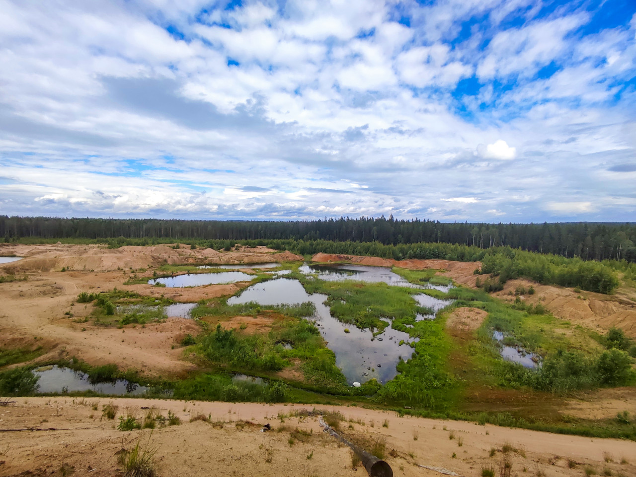природа открытый воздух естественная среда природная зона природный ландшафт пейзаж ландшафтная фотография растительность лес деревья небо песчаный карьер карьер песок песчаные отвалы водоём пруды лужи заболоченный участок камыш прибрежная растительность зелёные островки хвойный лес лесная кромка облака облачное небо голубое небо панорамный вид вид с высоты отражение неба грунтовая дорога труба сток воды индустриальный ландшафт рекультивация экологияПохожие фотографии