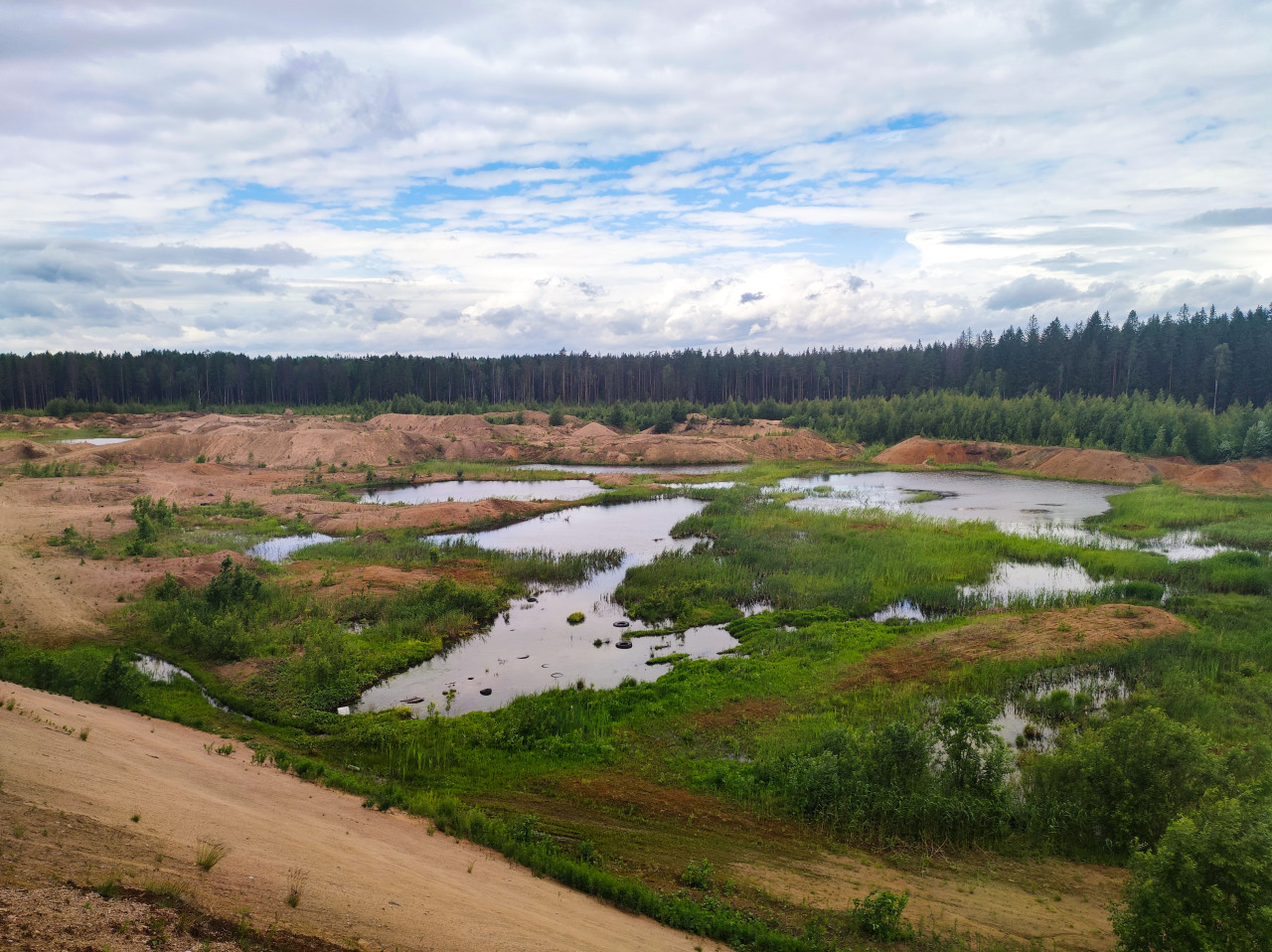 Панорамный вид на заброшенный песчаный карьер: среди песчаных насыпей и размытых грунтовых участков видны неглубокие водоёмы и протоки, местами с ровной зеркальной поверхностью и отражением облаков. Берега частично заросли травой, камышом и низким кустарником, на участках песка заметны колеи и следы эрозии. На горизонте тянется полоса хвойного леса, над местностью — плотная облачность с просветами голубого неба. Фото можно использовать в материалах об экологии, рекультивации, географии и природных маршрутах.