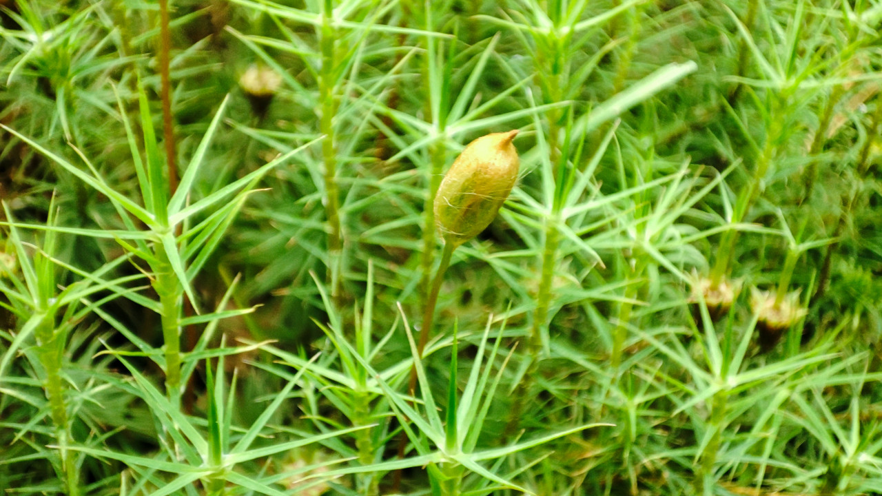 Спороносная коробочка мха в фокусе на фоне плотного зелёного ковра