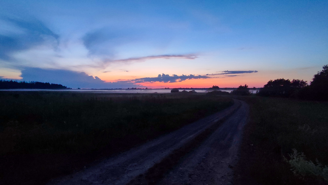 природа открытый воздух естественная среда природная зона природный ландшафт пейзаж ландшафтная фотография растительность лес деревья небо сельская местность поле луг просёлочная дорога грунтовка поворот дороги горизонт линия леса кусты туман дымка вечер сумерки закат розовый горизонт облака облачный фронт синее небо спокойствие даль панорама лето безлюдно путешествия фонПохожие фотографии