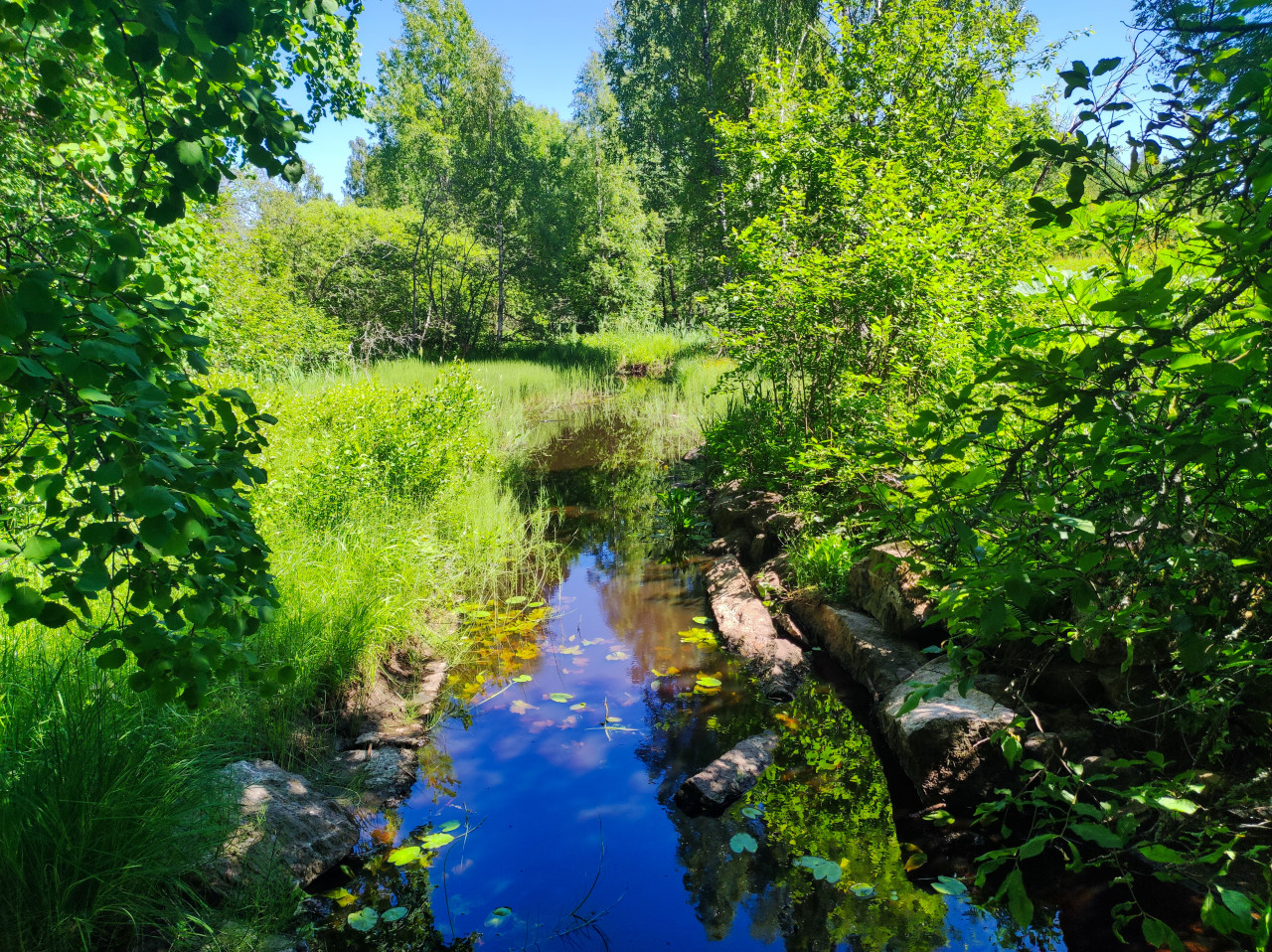 природа открытый воздух естественная среда природная зона загород растительность растения лес деревья дикорастущие растения лето дневной свет пейзаж лесной пейзаж водоем пруд ручей заболоченный участок стоячая вода отражение кувшинки листья на воде прибрежная растительность камни бревна берег зеленая трава кустарники березы солнечный день голубое небо дикая природа экология природный фон водная экосистемаПохожие фотографии