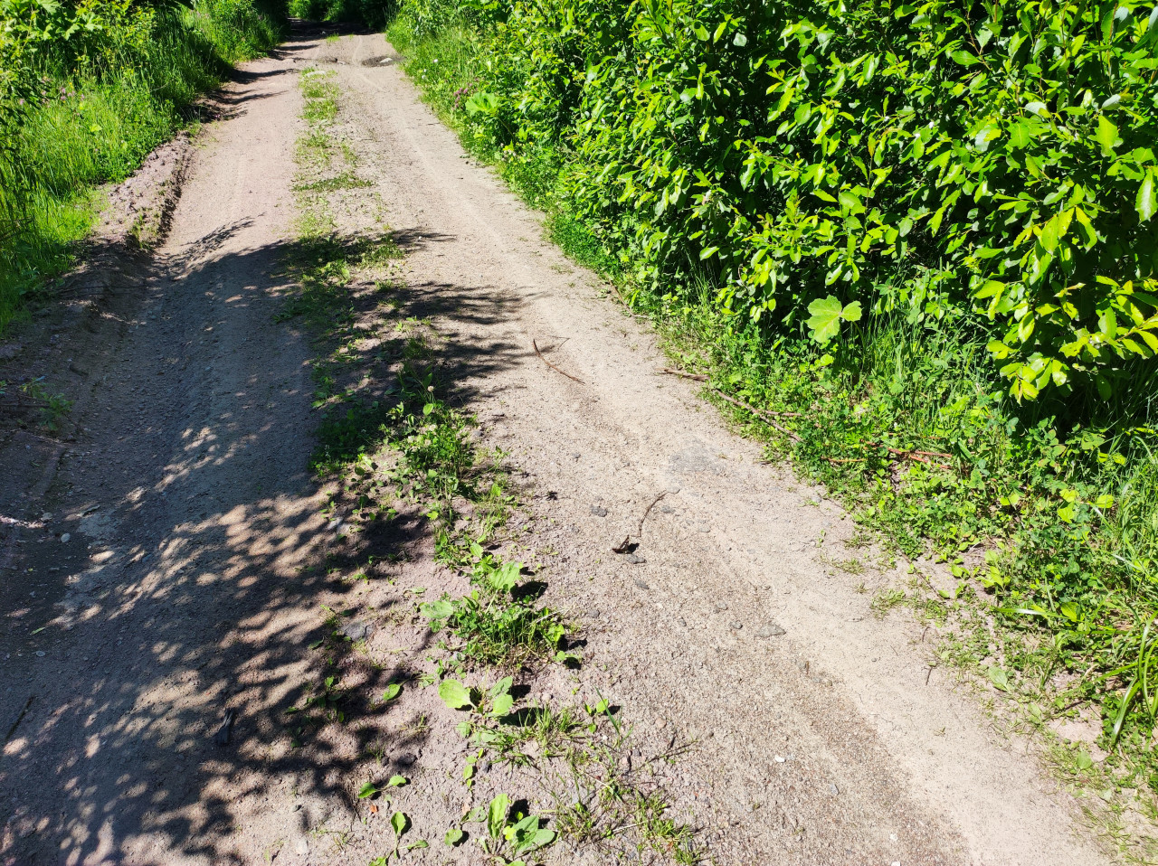 Ясный летний день, вид на грунтовую дорогу в зелёной зоне: две колеи уходят в перспективу, на песчано-гравийной поверхности заметны мелкие камни, просыпавшаяся земля и редкие ростки травы. Справа — плотные кусты с крупными листьями и низкая обочина, слева — травяной край и теневые пятна от листвы. На дороге лежат тонкие веточки и сухие листья. Контрастный свет подчёркивает фактуру грунта и неровности пути. Фотография подходит для статей о пеших тропах, загородных прогулках, туризме выходного дня и природных маршрутах.