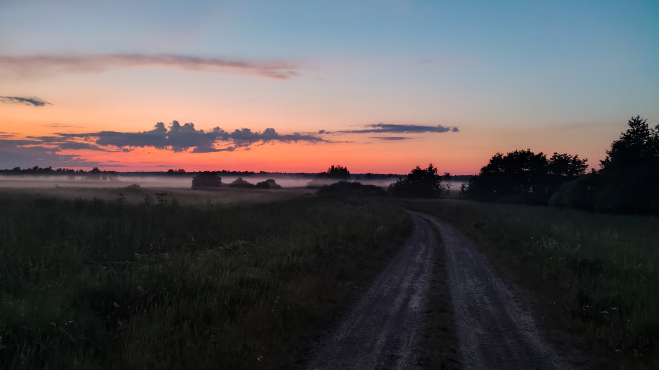 Просёлочная грунтовка среди травы на фоне закатного неба и тумана