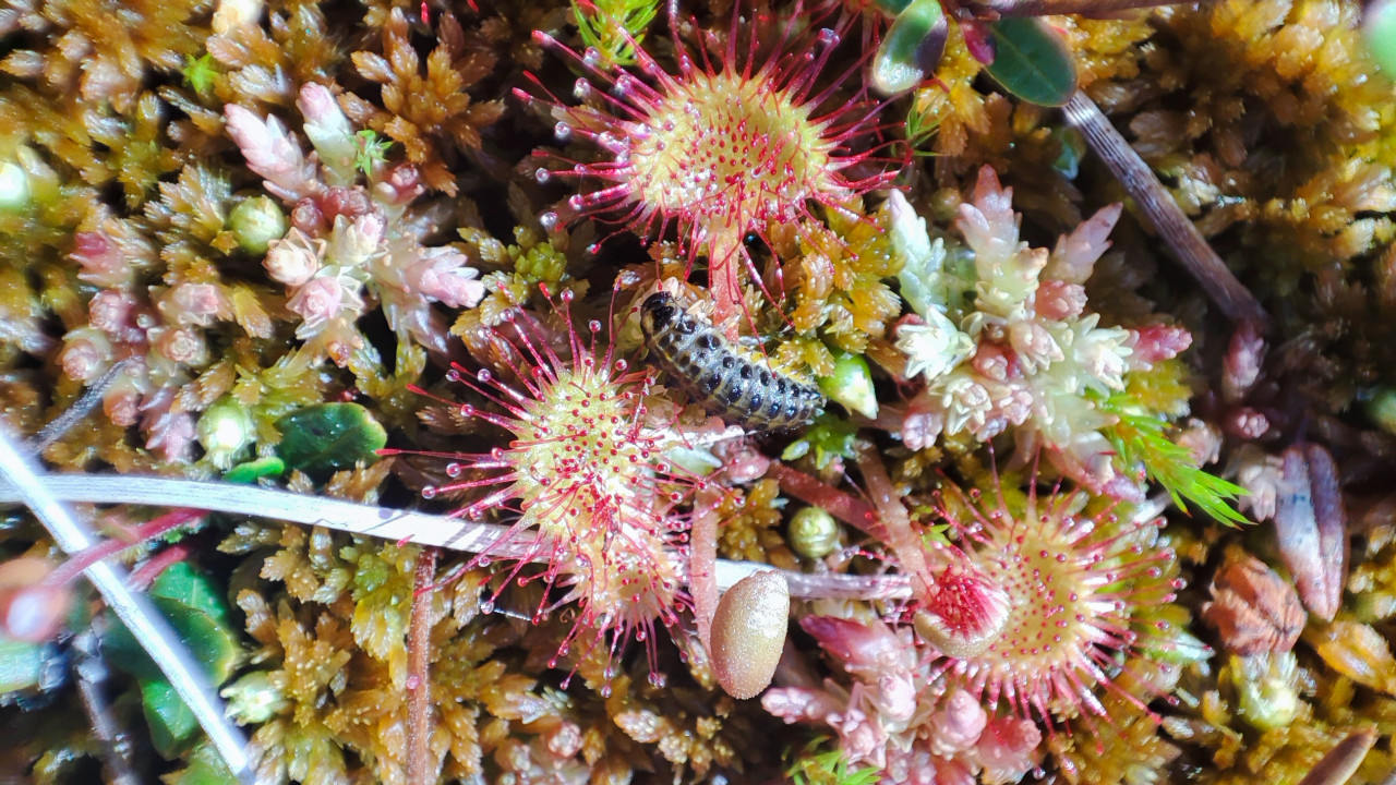 Крупный план мохового ковра с росянкой и личинкой насекомого: листовые ловушки с красными волосками покрыты каплями клейкого секрета, рядом лежит пятнистая личинка на подстилке между фрагментами сфагнума. В кадре заметны тонкие стебли и мелкие листочки болотных растений, свет естественный и яркий. Снято днём в тёплый сезон. Фотография подойдёт для иллюстраций о микромире, хищных растениях, насекомых и экологии болот, а также для учебных пособий и научпоп публикаций.