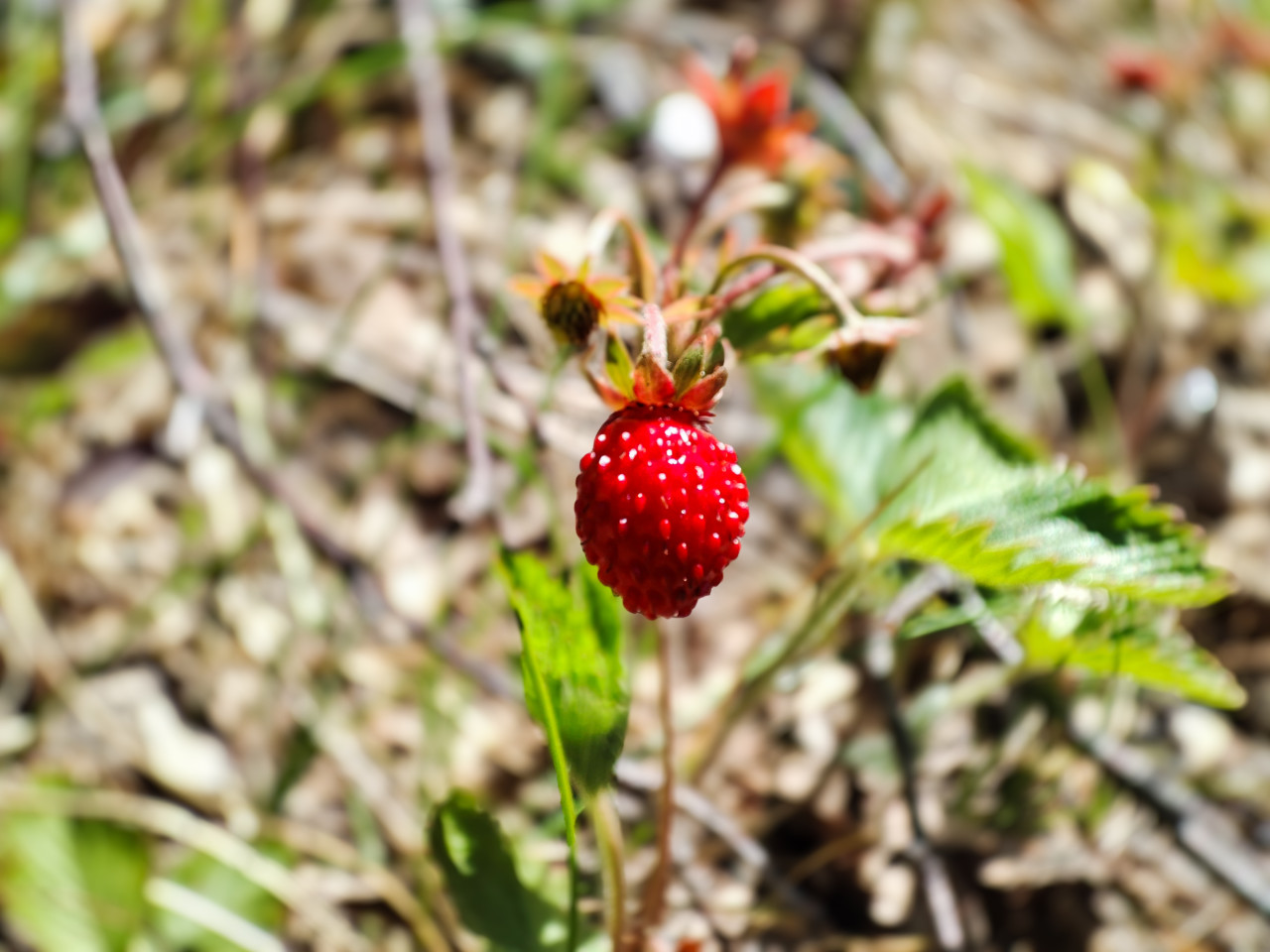 природа растения флора ягоды дикоросы съедобные растения листья ботаника лес земляника лесная ягода красная ягода ягода на стебле спелость макросъемка крупный план боке малая глубина резкости селективная резкость текстура ягод семена на поверхности зеленые листья чашелистики цветоножка лесная подстилка сухая трава веточки натуральный фон лето солнечный день сбор урожая натуральная еда место для текста природная фотографияПохожие фотографии