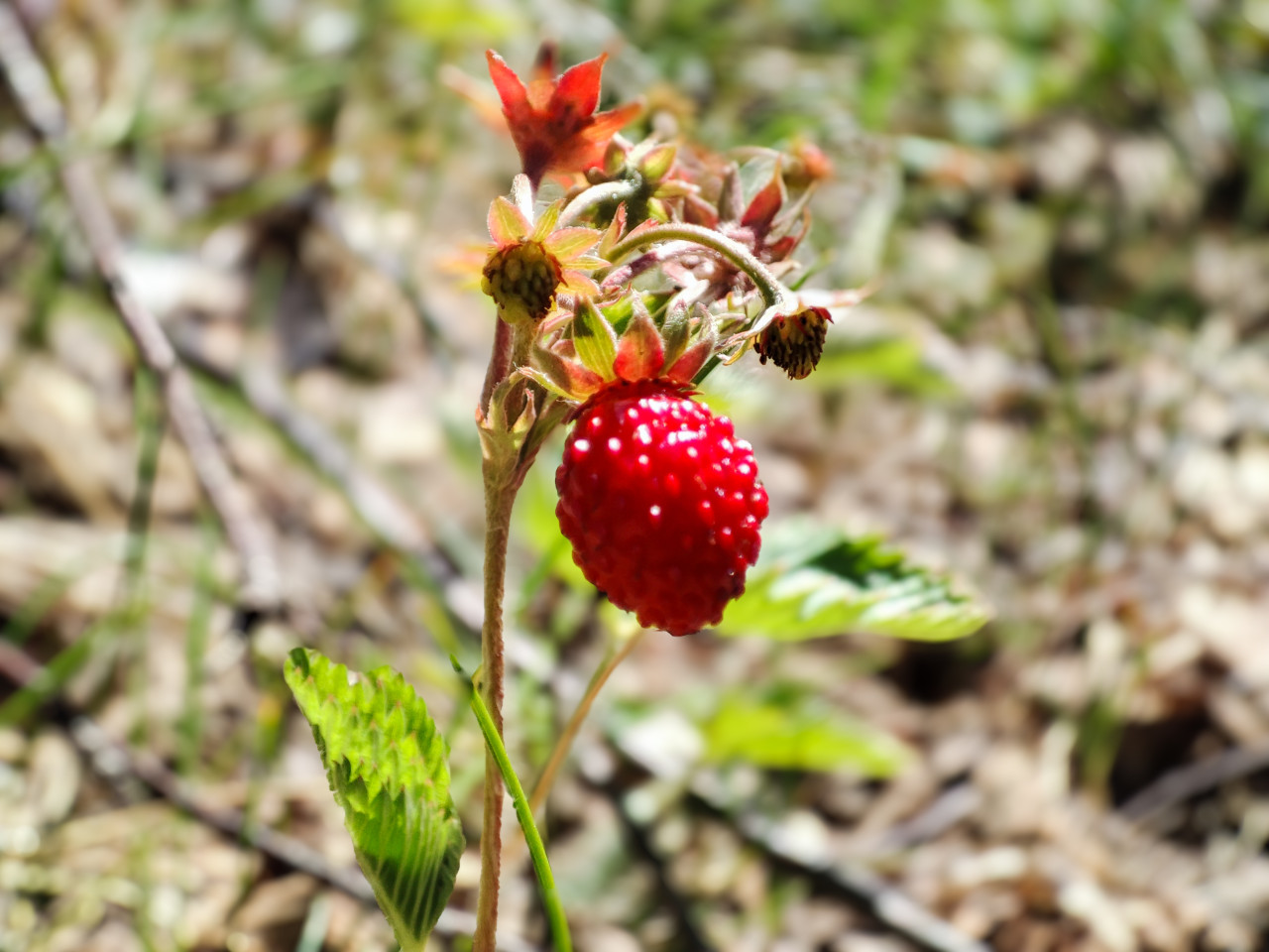 Крупный план лесной земляники: на тонком опушённом стебле висит спелая красная ягода, рядом видны зелёные чашелистики, бутоны и увядающий цветок. Ниже различимы тройчатые листья с зубчатым краем и молодые побеги. На заднем плане в сильном размытии читаются трава, сухие веточки и светлая лесная подстилка; солнечный свет даёт контраст и блики на зернистой поверхности плода. Съёмка выполнена на уровне земли в тёплый летний день. Подходит для иллюстраций о дикоросах, экологии, здоровом питании, сезонных продуктах и рецептах.