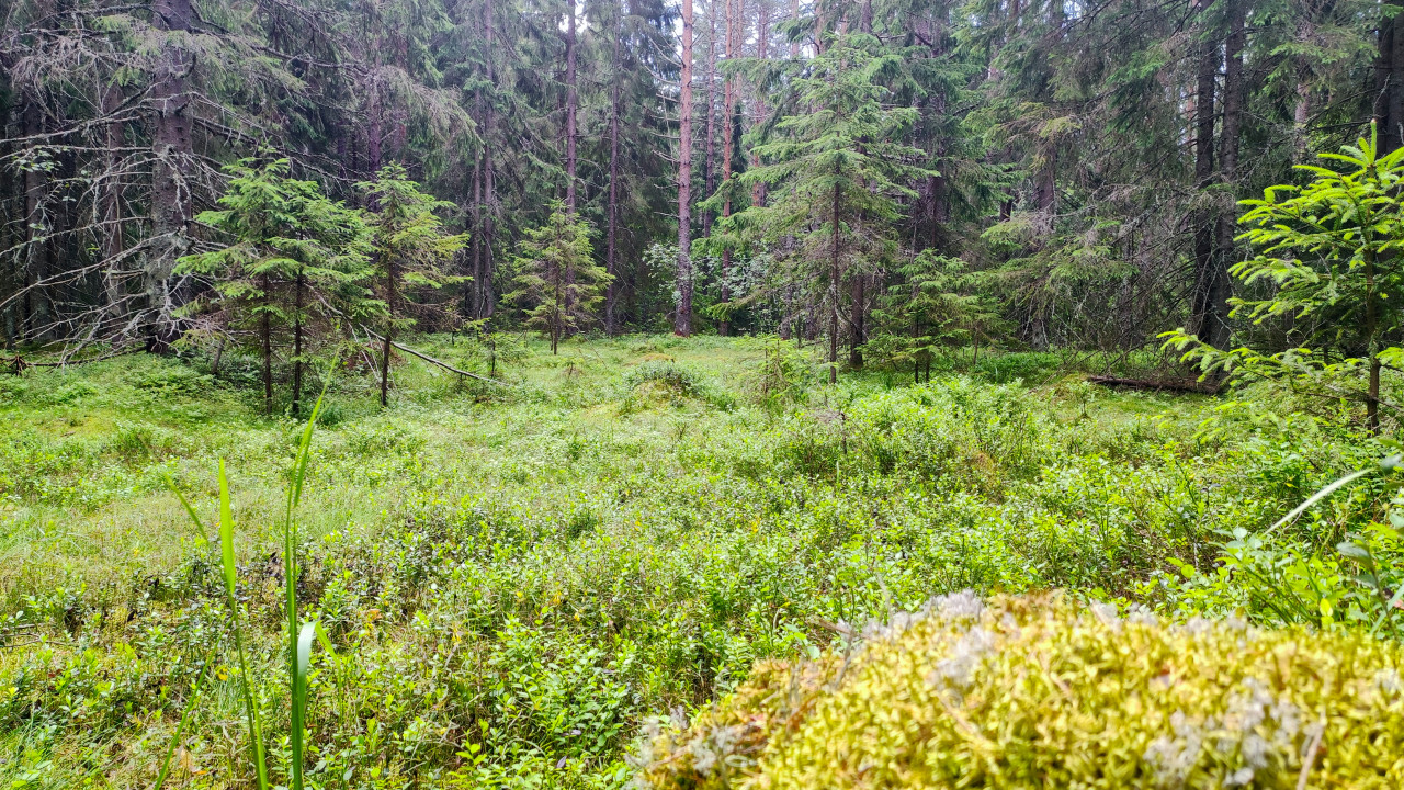 На снимке тихая лесная поляна в хвойном массиве: по краям стоят ели и высокие стволы деревьев, а на земле тянется сплошной ковер из мха и низких кустарничков, местами заметны травы и небольшие кочки. Свет мягкий, без резких теней, что похоже на пасмурный день или фильтрацию света кронами. Кадр подходит для иллюстраций о лесных биотопах, природных ландшафтах и сезонной зелени, для туристических материалов, оформления сайтов о путешествиях, экологии и заповедных территориях.