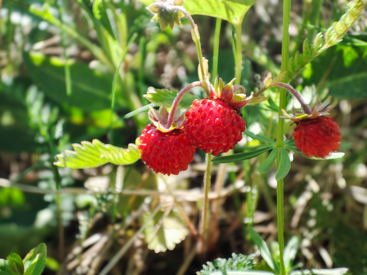 Три ягоды лесной земляники на плодоножках крупным планом