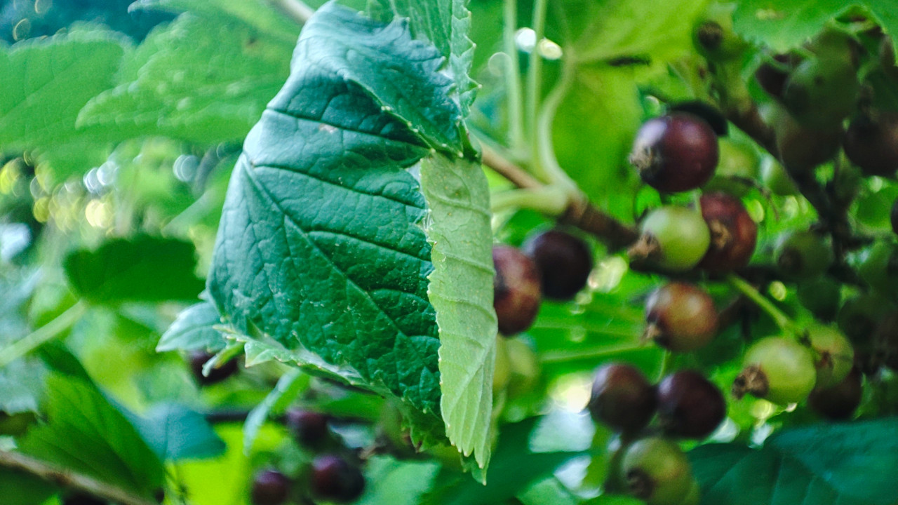 Сюжетная крупная съёмка ягодного кустарника: на заднем плане видна гроздь ягод смородины, часть плодов ещё зелёные, часть темнеет, а на переднем плане в фокусе крупный лист с выраженной фактурой и подсветкой по краю. В кадре много зелени, веточек и бликов, глубина резкости небольшая, поэтому ягодник выглядит объёмно и живо. Съёмка в летний день на естественном освещении. Фото подходит для материалов о выращивании ягод, сезонности, садовых культурах, а также для статей о домашнем огороде и урожае.