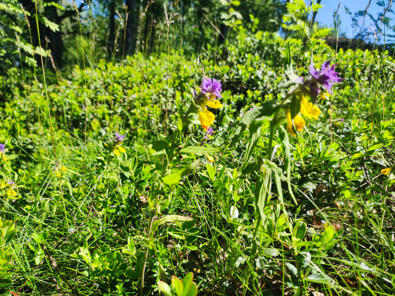 Общий план летней поляны: среди высокой травы и низкого кустарника растут полевые цветы с фиолетовыми верхушками и жёлтыми лепестками. Съёмка выполнена на открытом солнце, зелёная масса листьев и стеблей создаёт плотный фон, а в глубине кадра видны деревья и фрагменты голубого неба. Резкость мягкая, с акцентом на растения среднего плана, что подчёркивает естественную среду и ощущение прогулки. Фото подойдёт для иллюстраций о ландшафтах, экологии, летнем отдыхе и природной флоре.