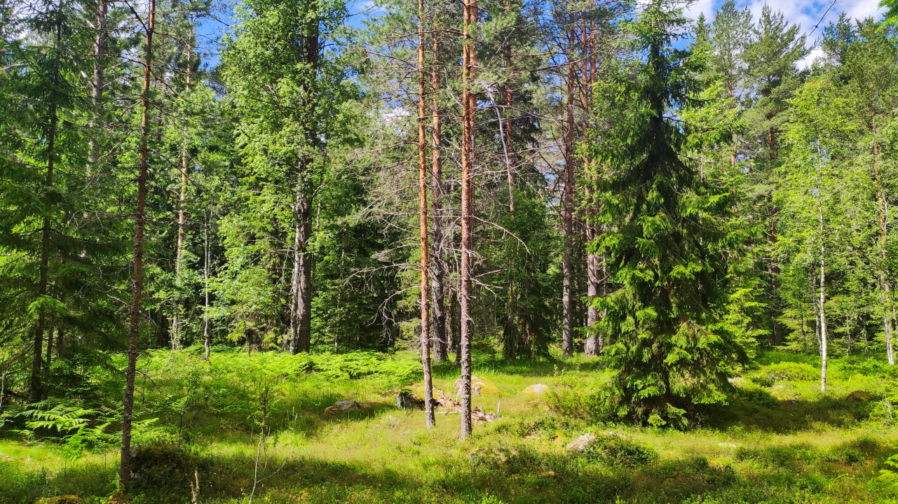 природа открытый воздух естественная среда природная зона загород растительность растения лес деревья дикорастущие растения лето дневной свет смешанный лес сосна ель лиственные деревья стволы деревьев кроны солнечный свет солнечный день голубое небо облака лесная поляна папоротник травы мох зелень подлесок природный ландшафт дикая природа экология биоразнообразие прогулка поход туризм фон пейзажПохожие фотографии