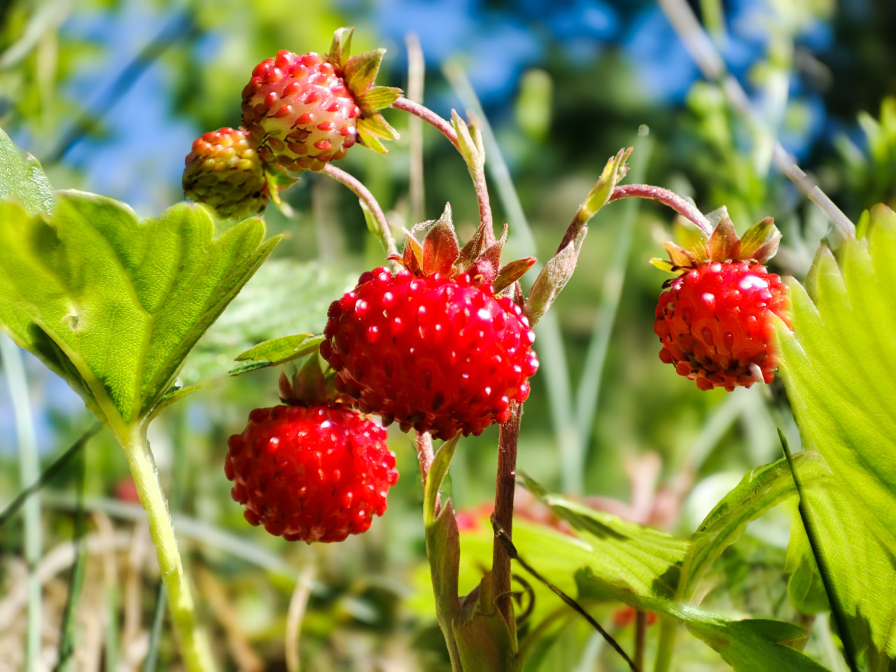 Низкий ракурс на растение лесной земляники: несколько ягод свисают на тонких стеблях, центральный плод крупнее и ярче остальных, сверху виден более светлый, еще созревающий. По краям кадра присутствуют зеленые листья, на заднем плане размытые стебли травы и участок голубого неба, что добавляет ощущение открытого пространства. Солнечный свет подчеркивает форму чашелистиков, опушение плодоножек и блеск поверхности плодов. Фото подходит для тем летней природы, дикоросов, сбора ягод, туризма и иллюстраций к кулинарным материалам о сезонных продуктах.