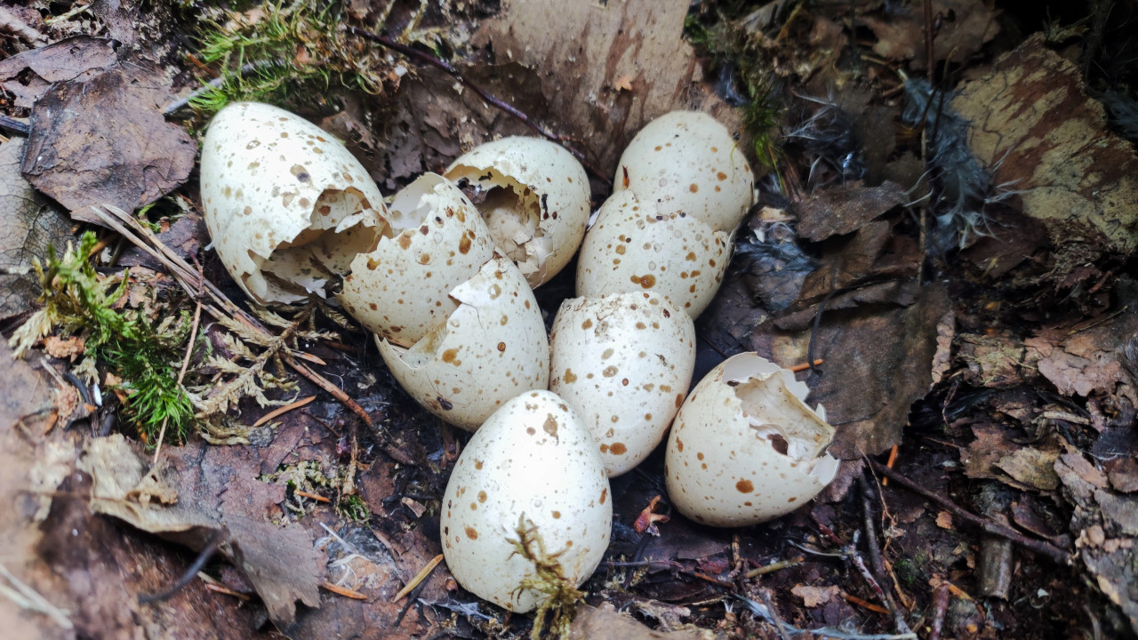 На фото крупным планом показаны светлые пятнистые скорлупки птичьих яиц, лежащие на влажной лесной подстилке. Вокруг видны прошлогодние листья, кусочки мха, хвоя, мелкие веточки и тёмная почва; часть скорлупы расколота и раскрыта. Сцена снята у земли в естественном освещении, по зелени и состоянию подстилки это тёплый сезон. Изображение подходит для материалов о природе, размножении птиц, экологии леса, а также для учебных и иллюстративных публикаций.