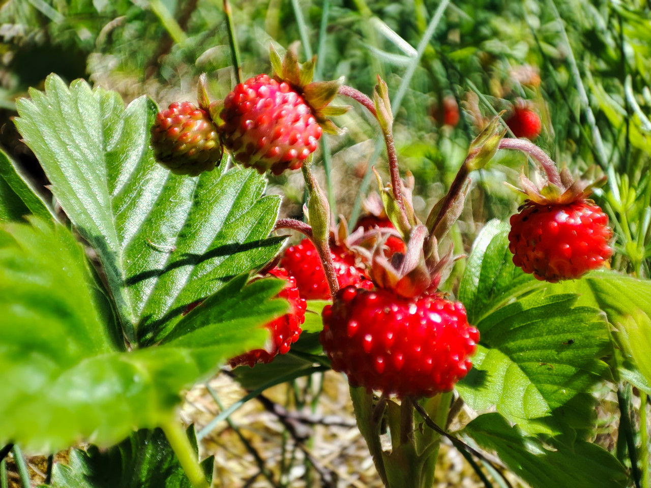 Фрагмент растения земляники на уровне земли: несколько спелых красных ягод расположены среди зеленых листьев и переплетенных травинок. В кадре заметны чашелистики и опушенные стебли, а также один плод, который еще не полностью покраснел. На заднем плане читаются размытые кустики и сухая подстилка, создающие естественный лесной фон. Солнечный свет дает яркие блики на ягодах и тени от листьев, подчеркивая объем и текстуру. Фото подойдет для статей о дикоросах, сборе ягод, сезонной еде, походах и иллюстраций для экологических и образовательных материалов.
