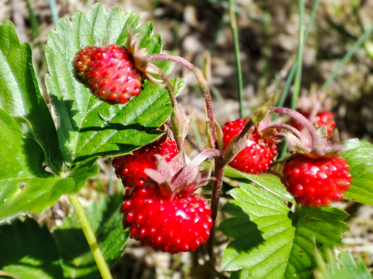 На фотографии крупным планом показаны ярко-красные бугристые ягоды земляники на тонких стеблях, рядом видны тройчатые зелёные листья с зубчатым краем и прожилками. Фон размывается в пятна травы и лесной подстилки, освещение жёсткое дневное, что даёт контрастные тени и блики на поверхности ягод. По визуальным признакам это тёплый сезон, съёмка на природе. Кадр подойдёт для материалов о дикорастущих ягодах, ботанике, сезонном сборе и для иллюстраций в экопроектах, блогах и справочниках. Может использоваться в дизайне упаковки, в рекламных макетах фермерских продуктов и в образовательных презентациях о растениях.
