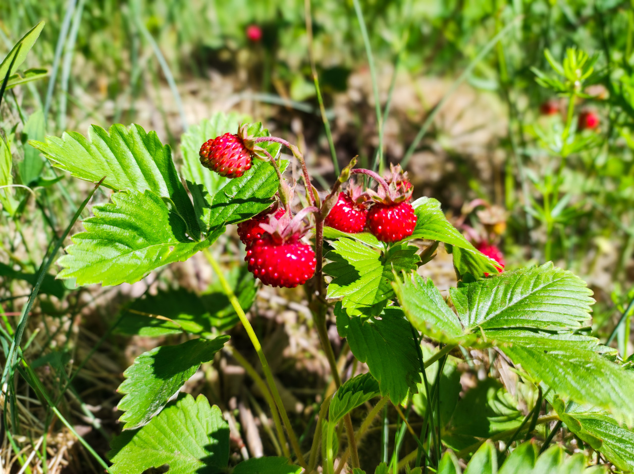 Снимок сделан с низкой точки: в центре кадра небольшой кустик земляники с несколькими красными ягодами разной степени зрелости и тройчатыми листьями с зубчатым краем. Вокруг видны стебли трав, сухие прошлогодние листья и фрагменты почвы, а задний план уходит в мягкое размытие. Яркое дневное солнце подчёркивает фактуру зелени и даёт контрастные тени. По насыщенной растительности читается летний сезон. Фото можно использовать в статьях о дикорастущих ягодах и лесной экосистеме, в туристических заметках, в учебных материалах по ботанике и в дизайне натуральных продуктов.