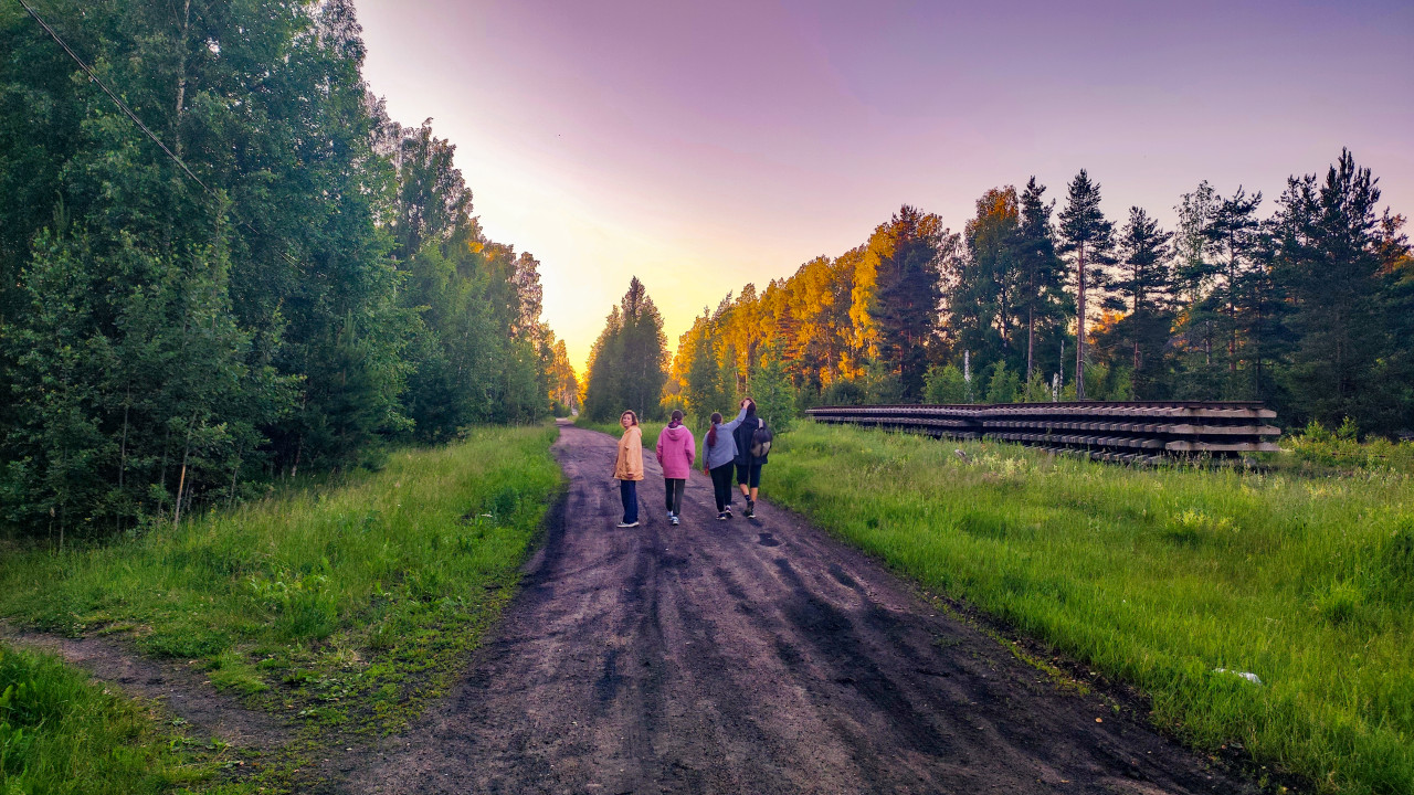 Группа людей идёт по лесной грунтовой дороге на закате рядом со штабелем шпал