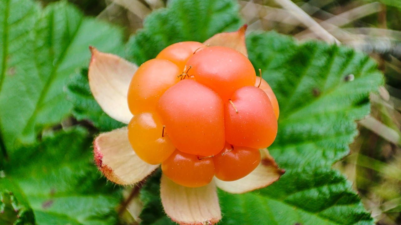природа растения флора ягоды дикоросы съедобные растения листья ботаника морошка северная природа дикорастущие ягоды лесные ягоды созревание оранжевый плод растение зелёная листва чашелистики макросъёмка крупный план малая глубина резкости природный фон болото торфяник мох сухие стебли влажная среда лето сезон сбора натуральный продукт экология Rubus chamaemorusПохожие фотографии