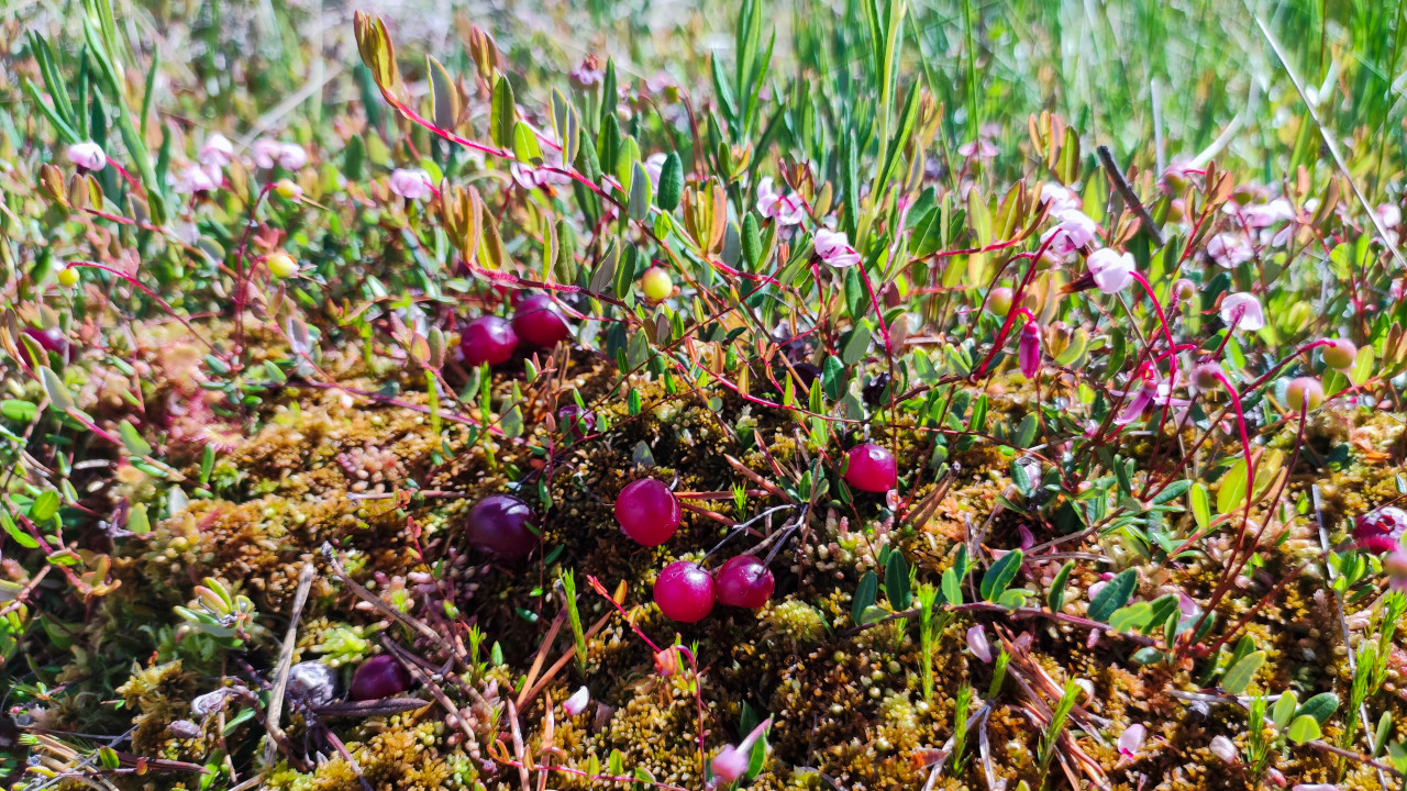 природа растения флора ягоды дикоросы съедобные растения листья ботаника болото торфяник болотная растительность сфагнум мох клюква болотная клюква Vaccinium oxycoccos красные ягоды цветение розовые цветки стелющиеся побеги травы кочка экосистема биоразнообразие северная природа полевые наблюдения экология природный фон летний сезон созревание ягод ягодникПохожие фотографии