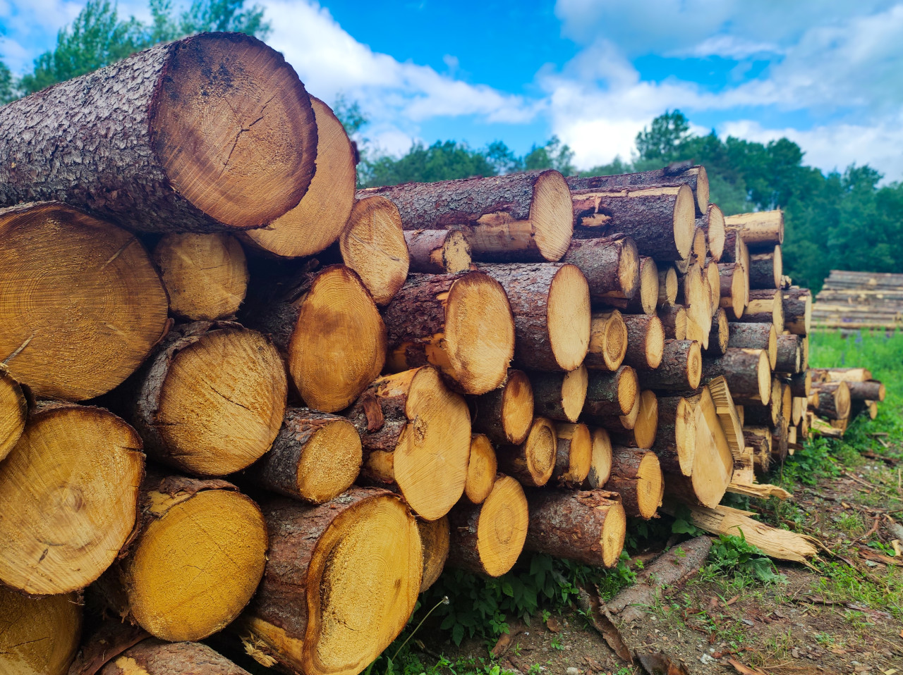 Низкий ракурс на штабель круглых бревен, сложенных на открытой площадке. На переднем плане крупные торцы с видимыми слоями древесины и корой; вдоль ряда тянутся стволы разного диаметра. На земле заметны щепа и обломки коры, рядом — зелёная растительность. Фон составляет лесная кромка и голубое небо с облаками, что подчёркивает открытое хранение. Снимок выполнен на лесосеке или складе лесоматериалов в светлое время дня. Подходит для иллюстраций о лесозаготовке, строительном сырье, природных ресурсах и теме переработки древесины.