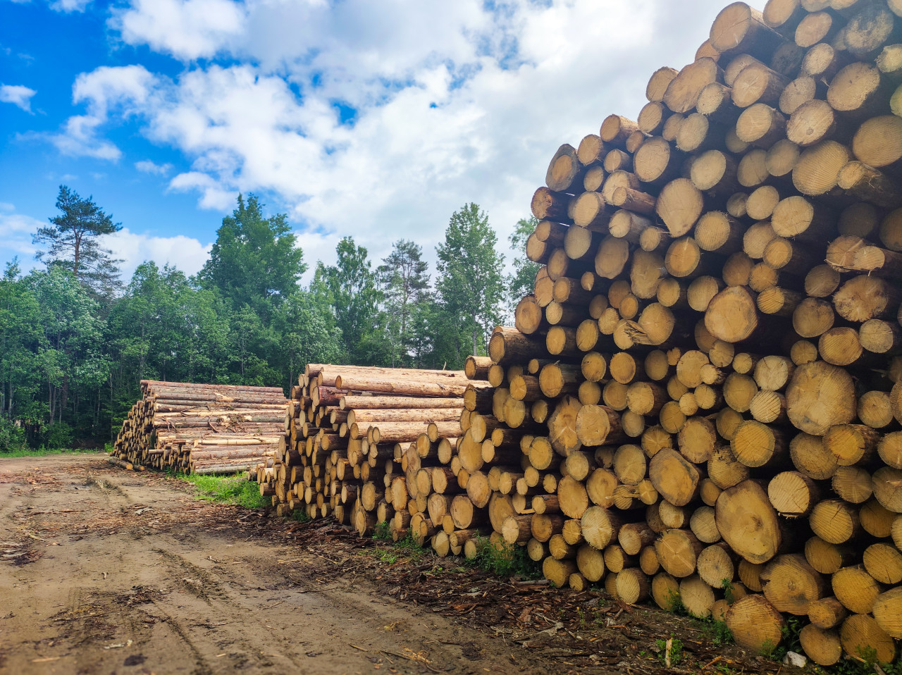 Штабели круглого леса на лесозаготовительной площадке у кромки леса