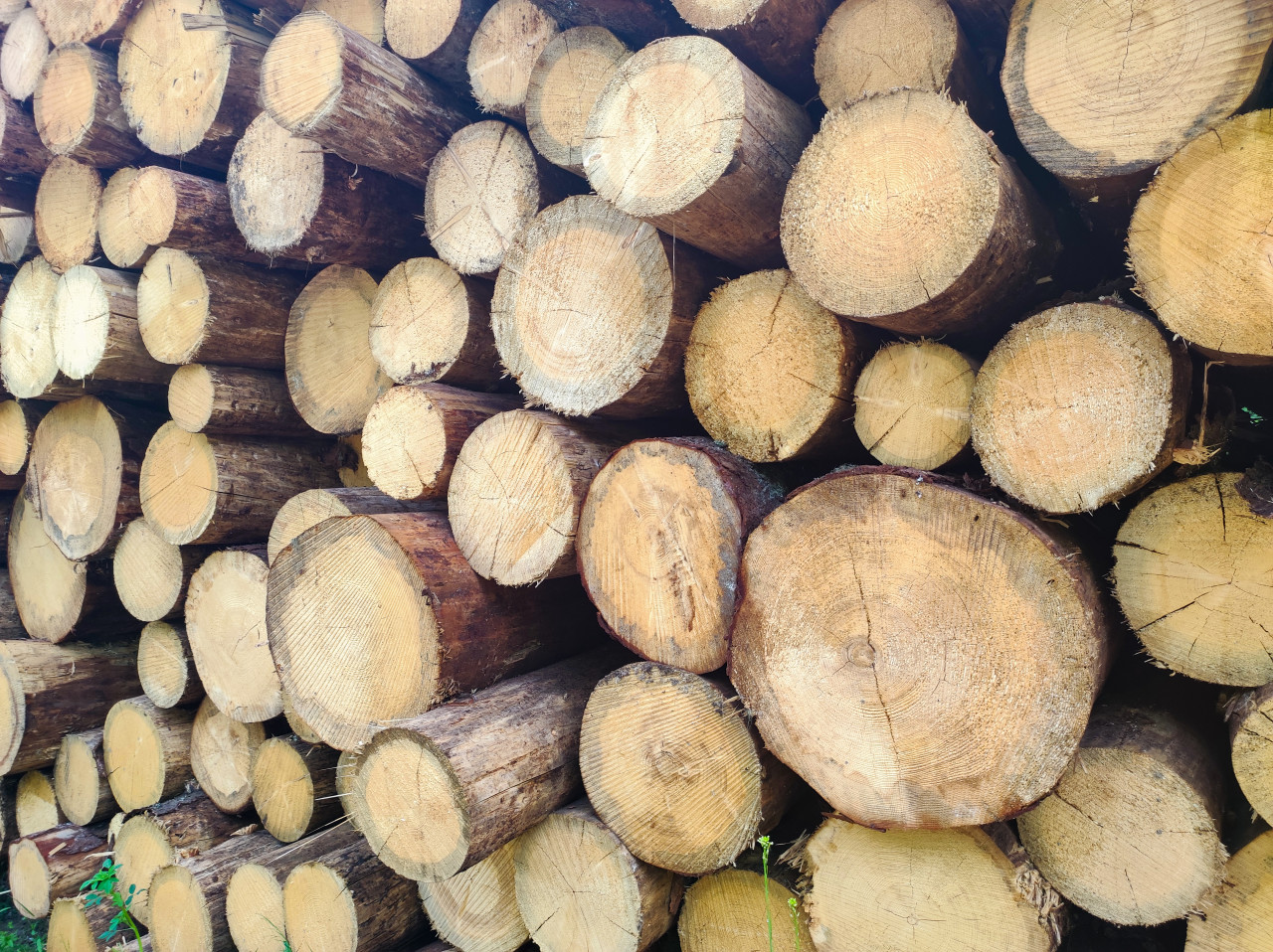 Торцы бревен в штабеле под углом, объёмная фактура древесины