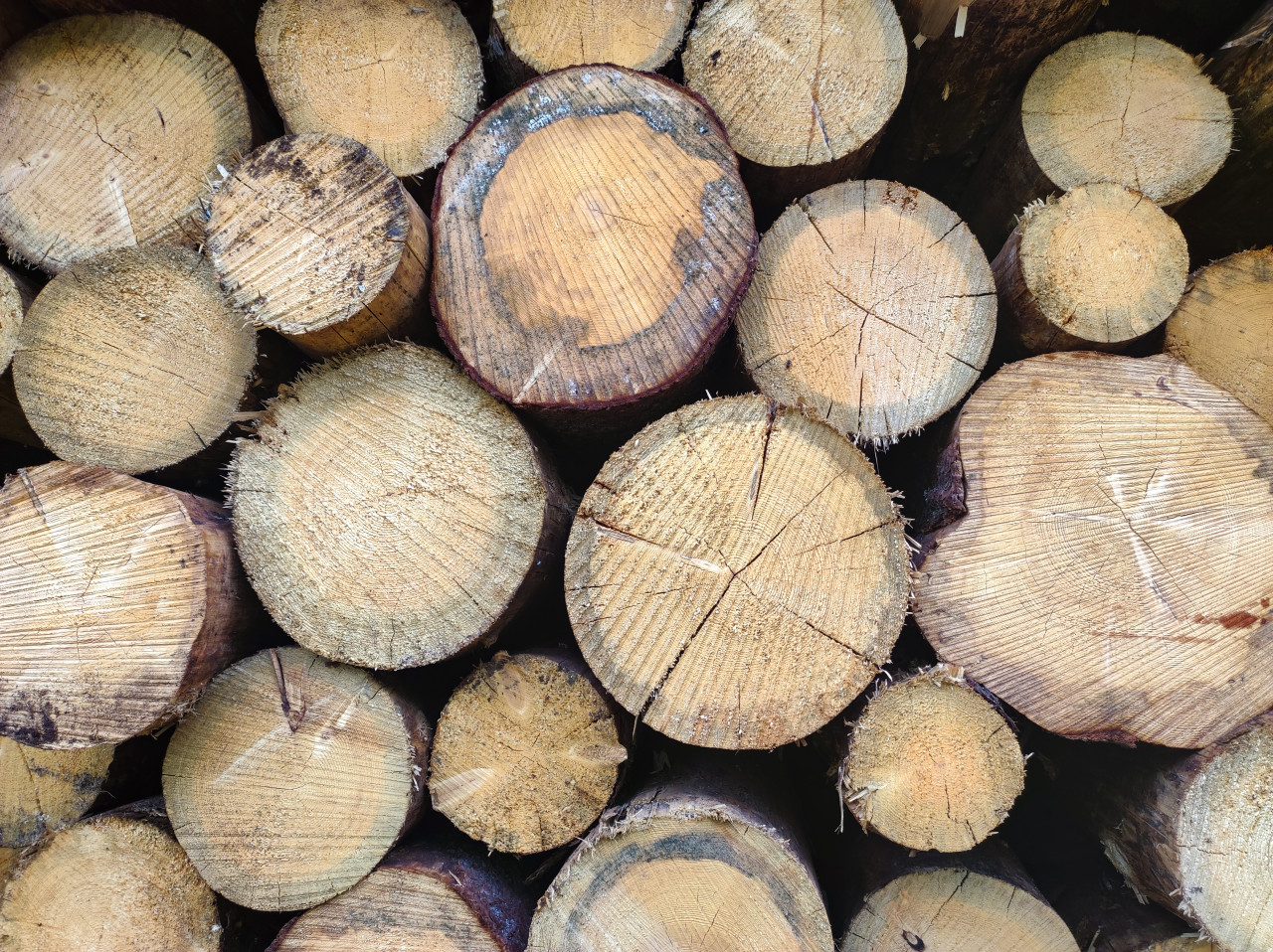 Макросъёмка торцов бревен в штабеле: несколько крупных спилов с выраженными годичными кольцами занимают центр и правую часть кадра, вокруг видны более тонкие стволы. На одном из торцов заметно тёмное кольцо и пятна, по поверхности идут радиальные трещины, а по краям выступает бахрома древесных волокон после реза. Снимок передаёт структуру материала и состояние свежей заготовки без лишних деталей окружения. Подходит для публикаций о лесной промышленности и деревообработке, а также для использования как фактурный фон в полиграфии и веб-дизайне.