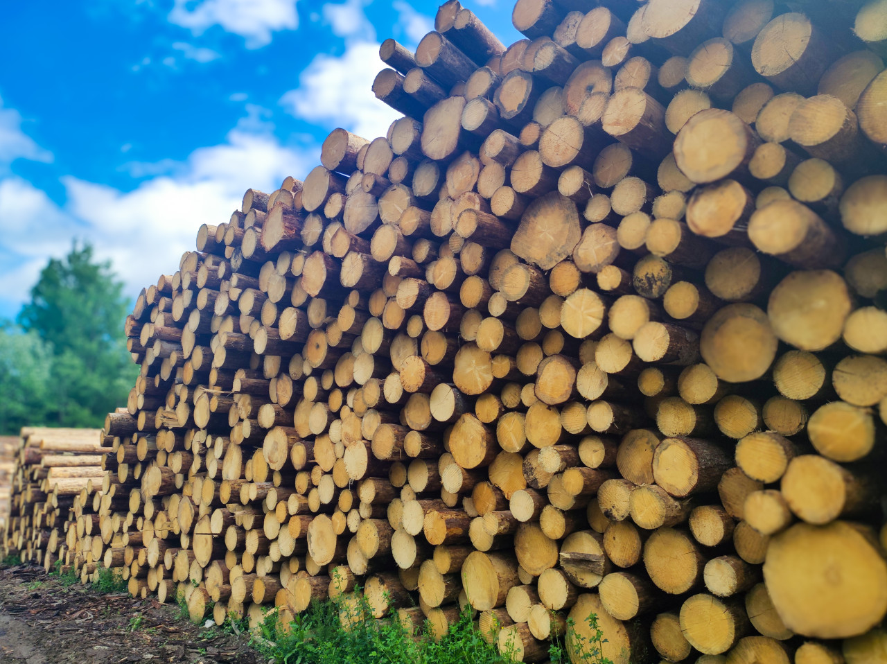 Штабель бревен снят с близкой точки и под углом: в кадре доминируют торцы с видимыми годичными кольцами, часть поверхности подчеркнута размытием фона. Диаметры стволов разные, некоторые торцы темнее, на отдельных бревнах видны следы коры. Внизу — зеленые растения у основания и следы складирования на влажном грунте; слева просматриваются дополнительные штабеля на площадке. Вверху — голубое небо с облаками. Подходит для материалов о лесном складе, сортировке кругляка, ресурсах и цепочке поставок, а также для иллюстраций к отчетам и презентациям.