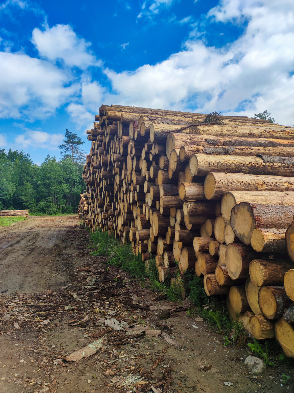 Штабель бревен у колейной дороги с видом на лес и дальний склад древесины