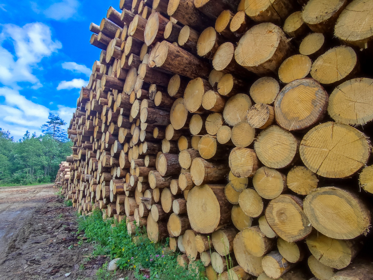 Перспективный вид вдоль высокой стены из уложенных бревен: торцы кругляка заполняют правую часть кадра, образуя ритм разного диаметра и текстуру спилов. Слева проходит грунтовая дорога с колеей, у основания штабеля растут травы и мелкие растения. В глубине видна кромка леса, сверху — голубое небо с облаками. Композиция показывает масштаб складирования древесины на открытой площадке. Использование: иллюстрации для тем о лесозаготовке, хранении лесоматериалов, промышленной логистике и строительном сырье.