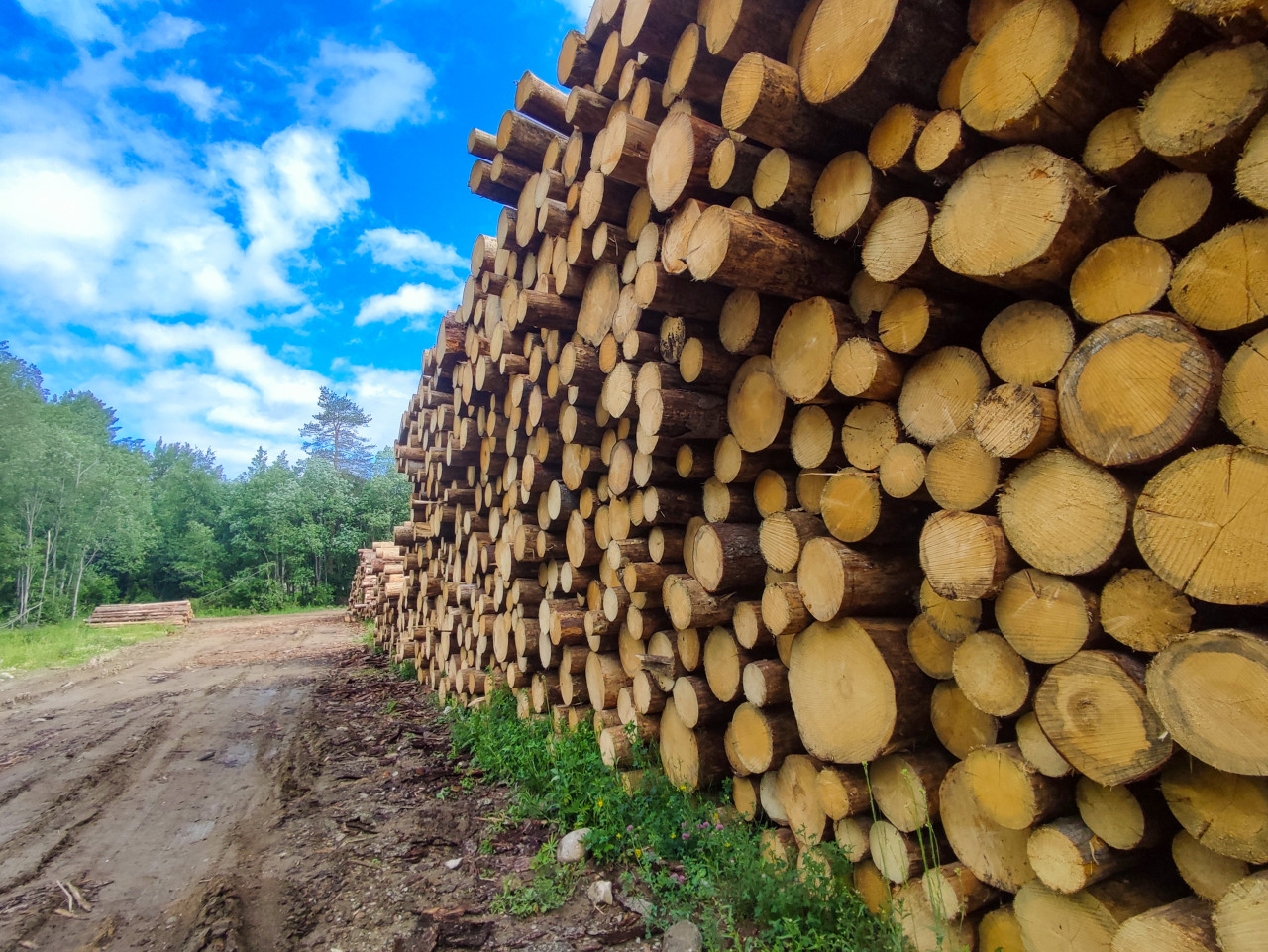 Стена из штабелированных бревен снята под углом, поэтому видны и торцы древесины, и уходящая вдаль линия укладки. Рядом проходит лесная грунтовка с колеями и участками влажной земли; у основания штабеля — трава и мелкие цветы. Вдали на дороге различим небольшой штабель, за ним начинается смешанный лес. Небо с облаками занимает значительную часть кадра и задает ощущение открытого пространства. Использование: публикации о лесных дорогах, вывозке древесины, производственных площадках, ресурсной экономике и промышленной тематике.