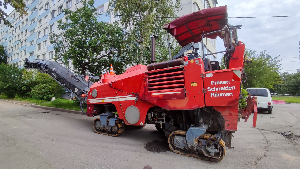 город городская среда городская инфраструктура двор дорожные работы ремонт дороги ремонт асфальта фрезерование дорожная техника строительная техника коммунальные службы благоустройство проезд дорожная фреза техника строительная машина гусеницы конвейер транспортёр Fräsen Schneiden Räumen сигнальный конус дворовой проезд жилой дом многоэтажка деревья парковка фургон техника крупным планом подготовка покрытия асфальтовая крошка промышленность сервис летоПохожие фотографии