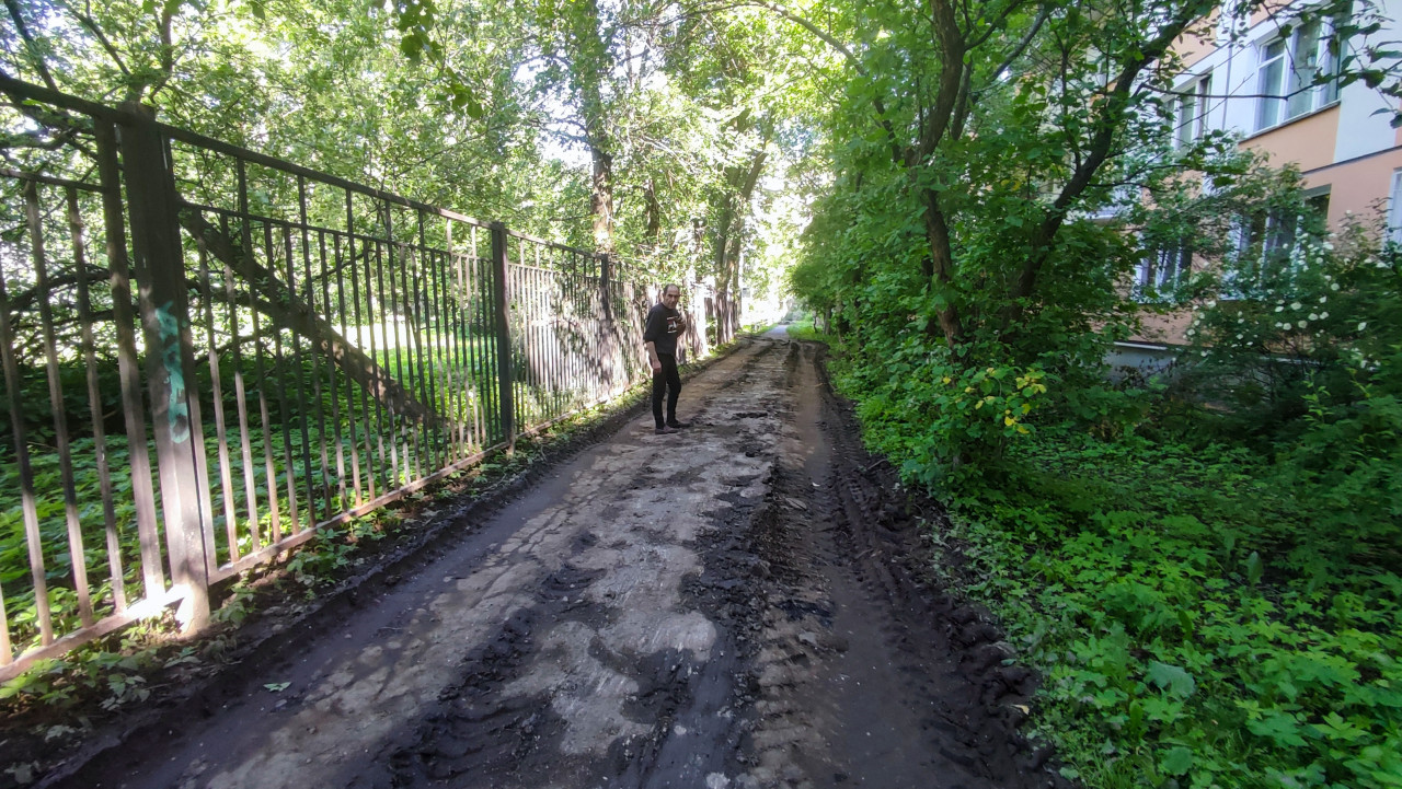 Грязная дворовая дорога со следами техники вдоль забора и зелёных насаждений