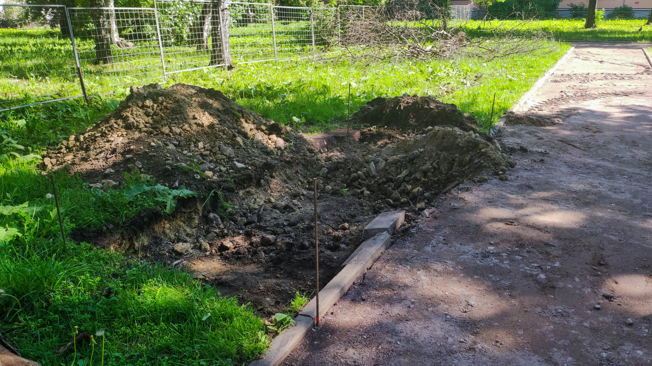 Траншея и кучи грунта у бордюра на участке ремонта пешеходной дорожки