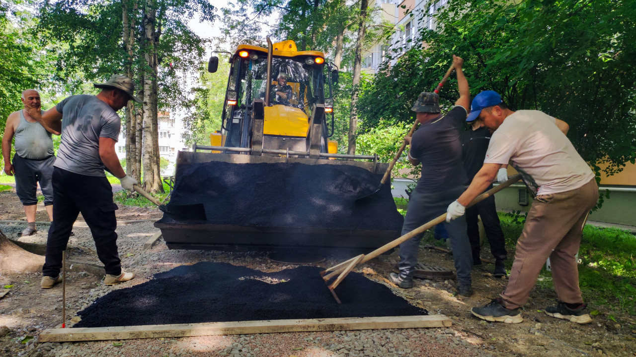 дорога дороги дорожные работы инфраструктура строительные работы строительство строительство дорог ремонт дорог благоустройство ЖКХ городская среда двор проезд асфальт горячая смесь укладка асфальта асфальтная масса пар дым разравнивание рабочие бригада спецтехника экскаватор погрузчик фронтальный ковш водитель лопата грабли щебень подготовка основания деревья кусты многоквартирный дом летоПохожие фотографии