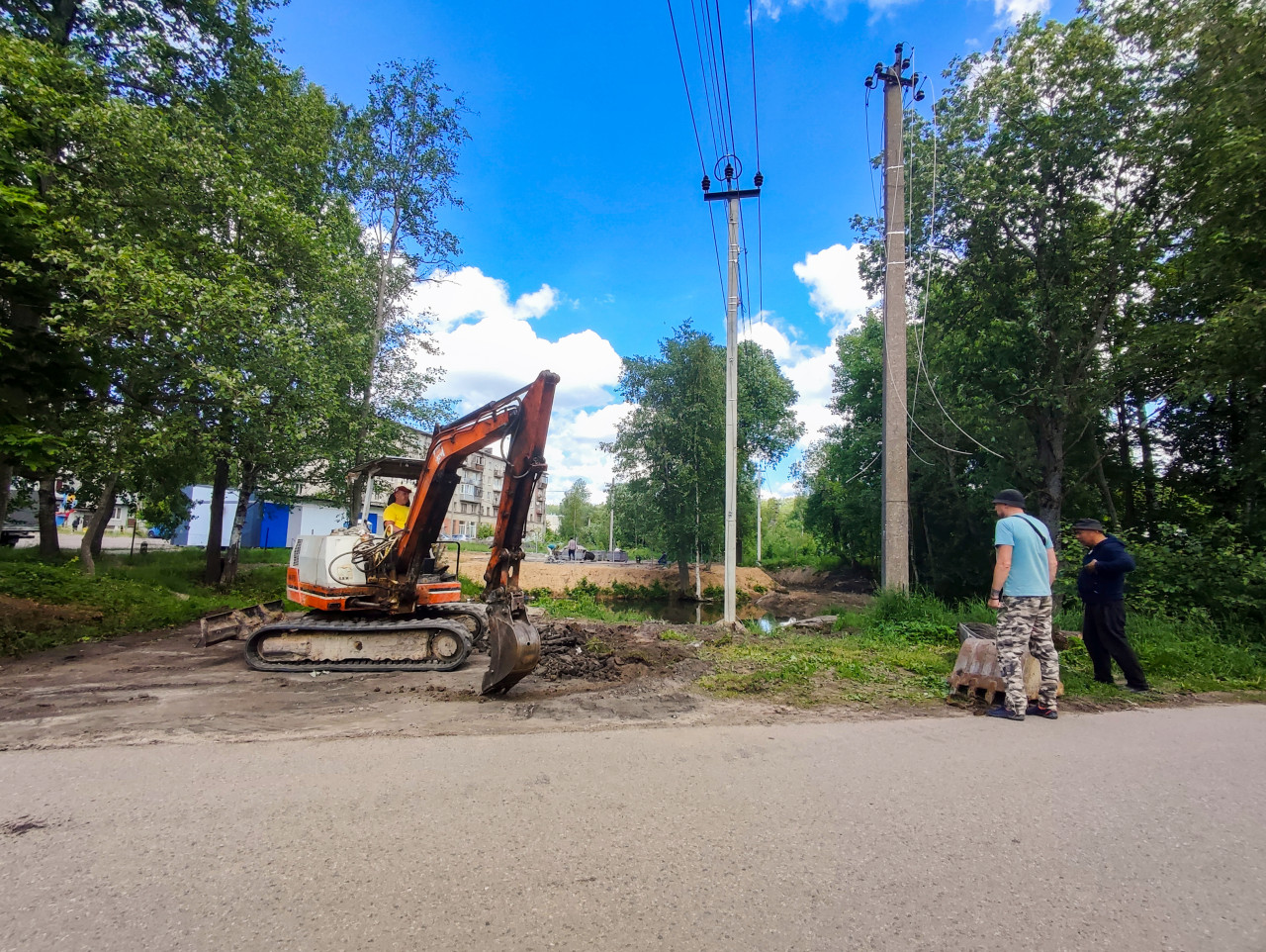 На обочине грунтовой дороги стоит мини-экскаватор на гусеницах с опущенным ковшом; в кабине заметен оператор в рабочей одежде. Справа двое мужчин наблюдают за работами рядом с выкопанным грунтом и металлической насадкой. Вдоль участка проходят бетонные опоры с проводами, рядом видна канава с водой и насыпь песка, ведущая к месту работ. Фон составляют деревья, кусты и жилые дома, над ними яркое голубое небо с кучевыми облаками. Фото подойдет для материалов о ремонте коммуникаций, благоустройстве, земляных работах и строительной технике.