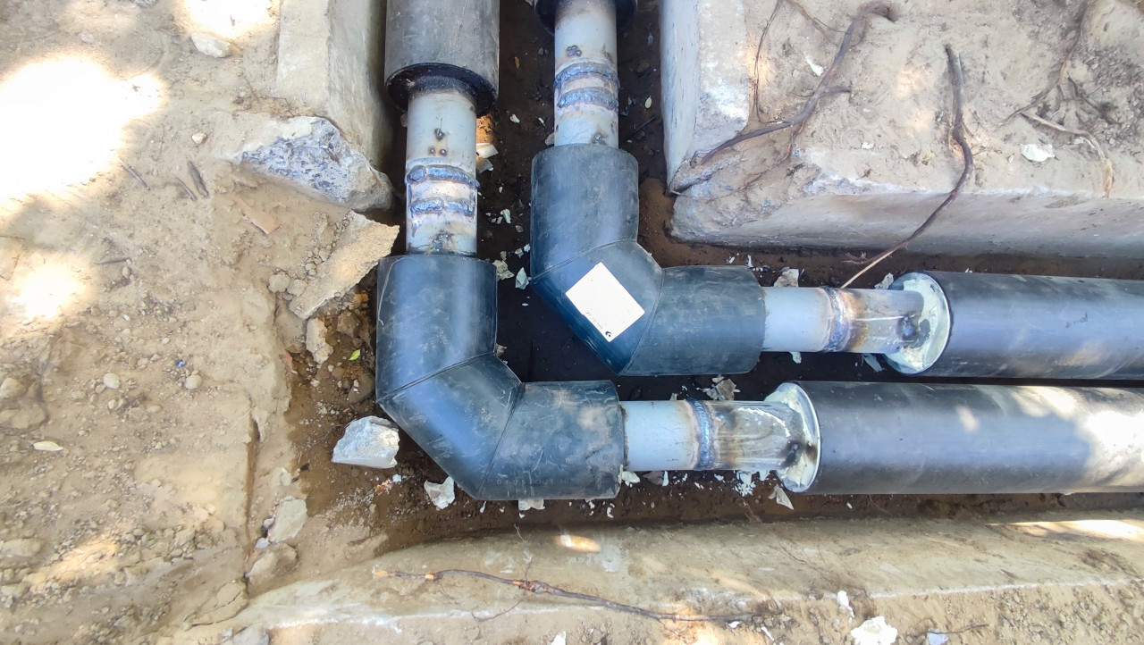 Сварные стыки трубопровода с поворотами в бетонном канале, вид сверху