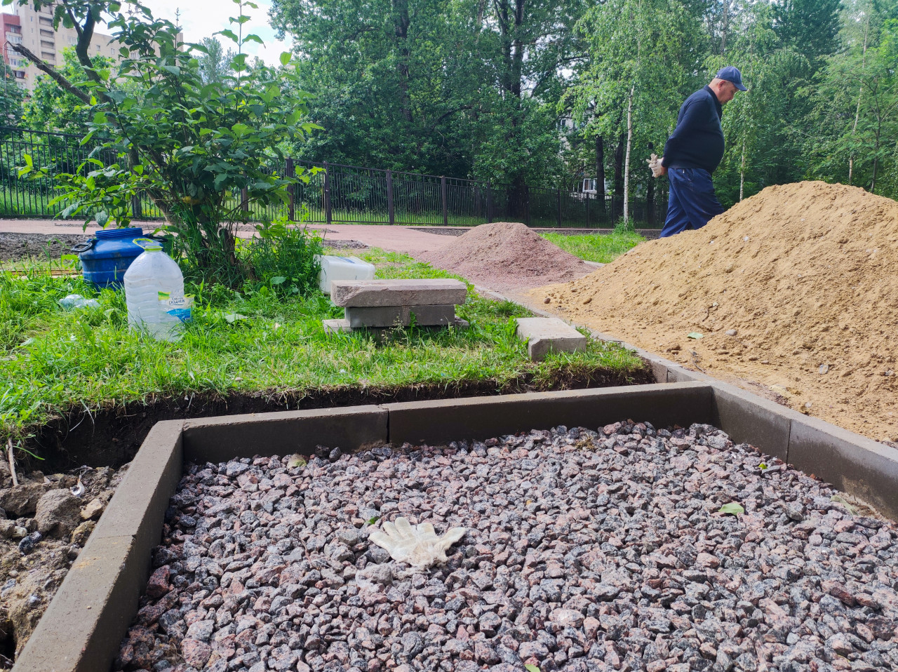 благоустройство благоустройство территории стройплощадка строительная площадка строительные работы строительство строительный участок город ремонт двор придомовая территория щебень щебёночная подушка основание бордюр бордюрный камень песок куча песка строительные материалы тротуарная плитка элементы мощения рабочая перчатка ручной труд организация работ ландшафтные работы подготовка покрытия дорожные работы пешеходная зона ограждение забор деревья зелёная зона пластиковая тара вода на объектеПохожие фотографии