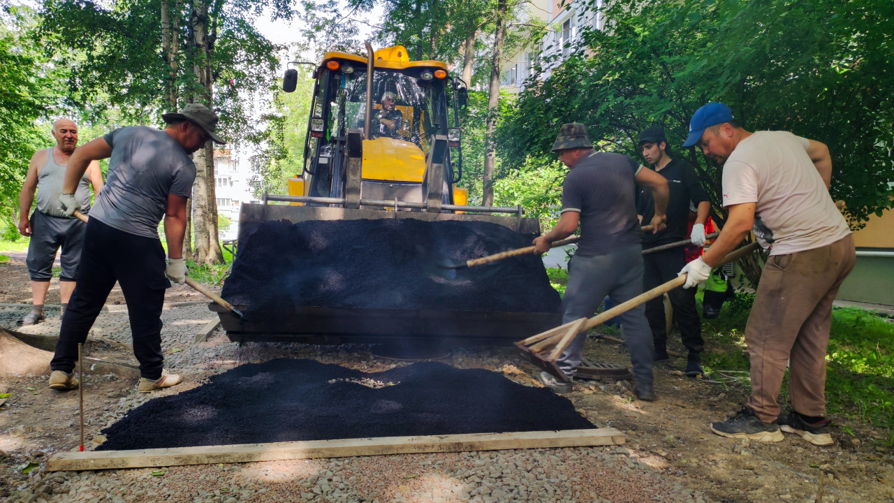 дорога дороги дорожные работы инфраструктура строительные работы строительство строительство дорог ремонт дорог благоустройство коммунальные службы двор придомовая территория дворовый проезд асфальт укладка асфальта горячий асфальт разравнивание ручной инструмент рабочие бригада спецтехника экскаватор погрузчик ковш лопата грабли перчатки щебень грунт кусты деревья тень фасад дома летоПохожие фотографии