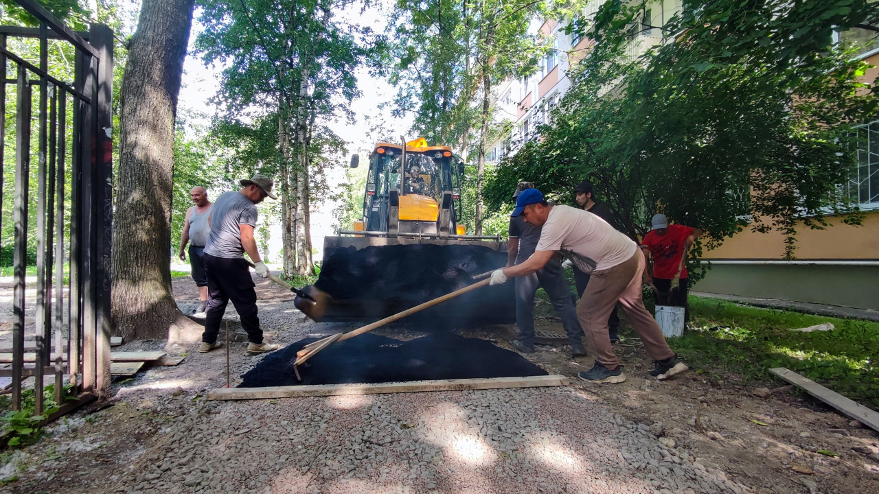 дорога дороги дорожные работы инфраструктура строительные работы строительство строительство дорог ремонт дорог благоустройство ЖКХ двор придомовая территория дворовый проезд асфальт укладка асфальта разравнивание горячая смесь пар ручной труд рабочие спецтехника экскаватор погрузчик ковш лопата грабли доски карта ремонта щебень подготовка основания деревья кустарник фасад дома летоПохожие фотографии