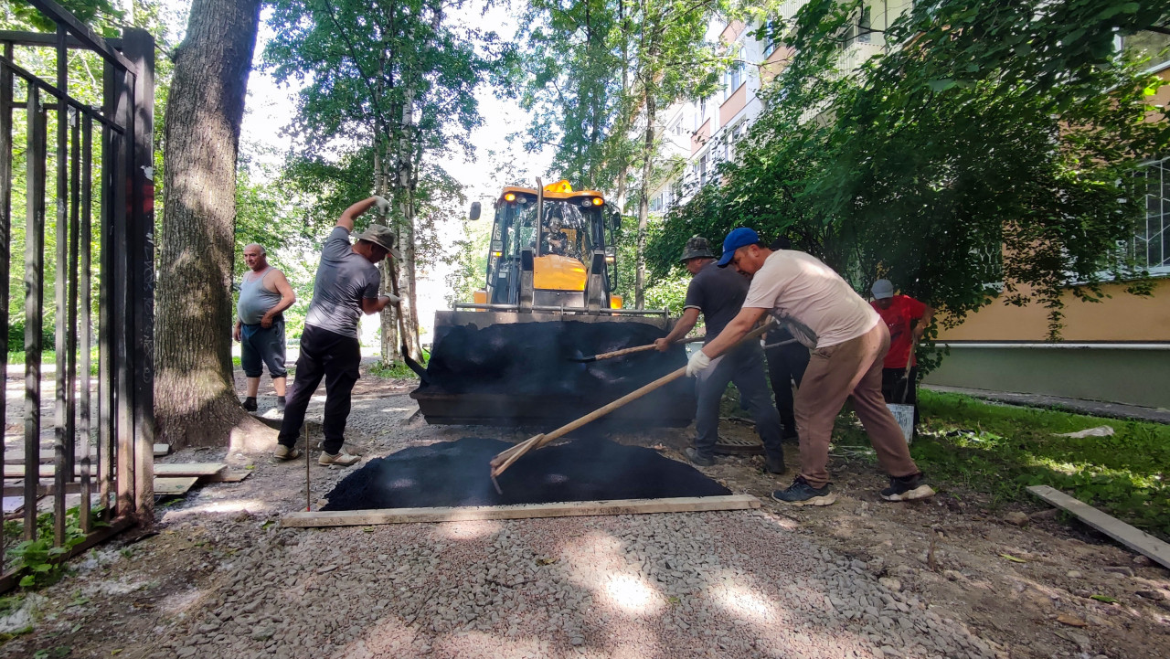 дорога дороги дорожные работы инфраструктура строительные работы строительство строительство дорог ремонт дорог благоустройство городская среда двор придомовая территория асфальтирование асфальт горячий асфальт дым пар укладка асфальта разравнивание рабочий процесс рабочие спецтехника экскаватор погрузчик ковш лопата грабли доски карта ремонта щебень грунт деревья кусты фасад дома летоПохожие фотографии