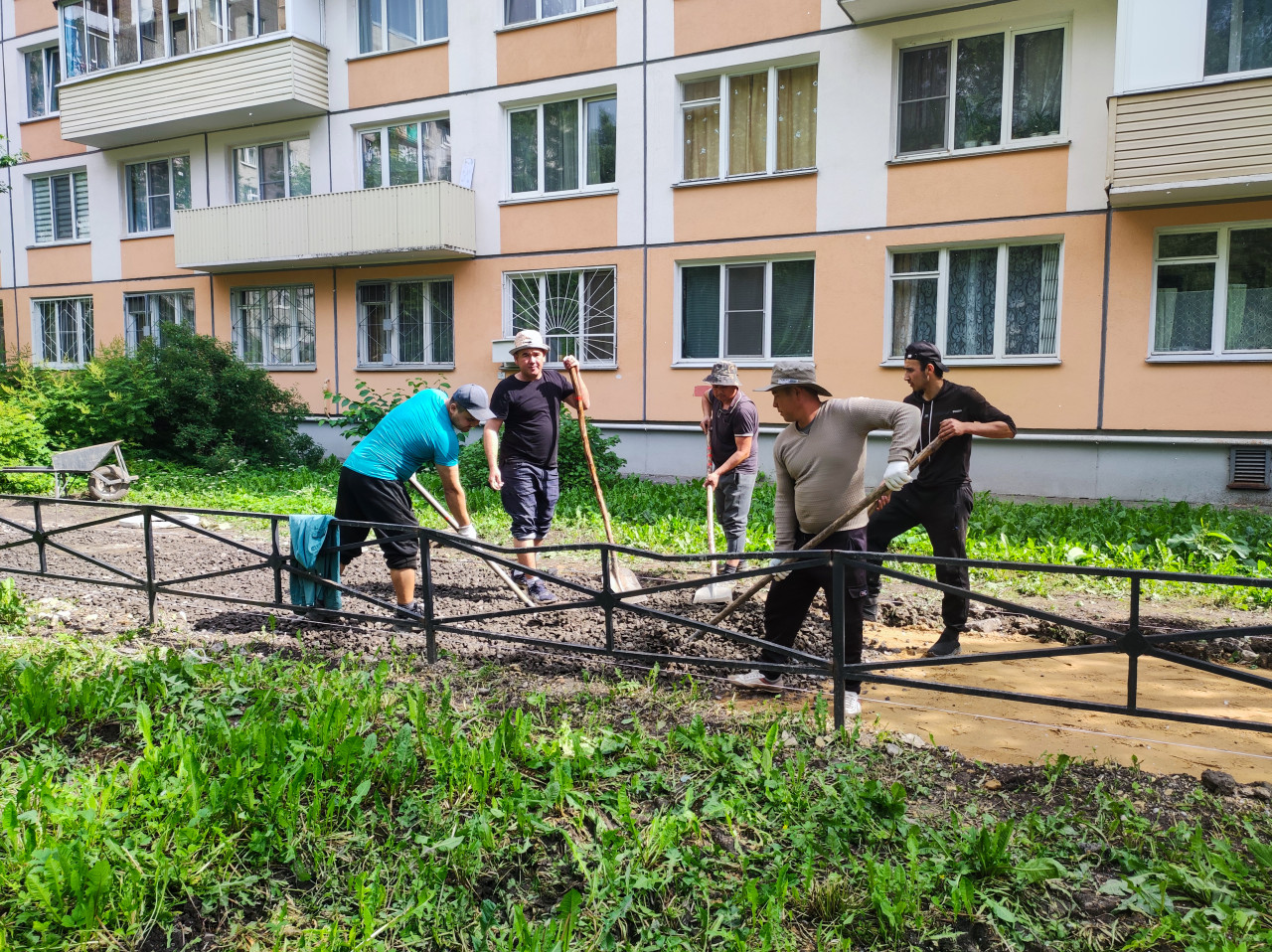 благоустройство благоустройство территории стройплощадка строительная площадка строительные работы строительство строительный участок город двор ремонт дорожек коммунальные работы рабочие бригада ручной труд лопата инструмент укладка щебня разравнивание щебёночное покрытие основание тротуара металлическое ограждение заборчик зелёная трава сорняки грунт фасад дома окна балконы жилой дом городская среда летний день ремонт двораПохожие фотографии