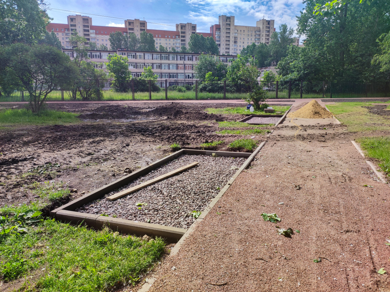 Общий вид дворовой территории в процессе ремонта: вдоль пешеходной дорожки уложены прямоугольные карты с щебёночной засыпкой и бетонным бордюром, внутри лежит длинная деревянная рейка для разметки. На газоне и грунте заметны следы земляных работ, участки разрытой почвы и влажные пятна после техники или полива. Справа видна куча песка, слева деревья и кустарники; на заднем плане за ограждением стоят низкое здание и многоэтажные дома. Снимок подходит для иллюстраций о благоустройстве, ремонте тротуаров и городской среде.
