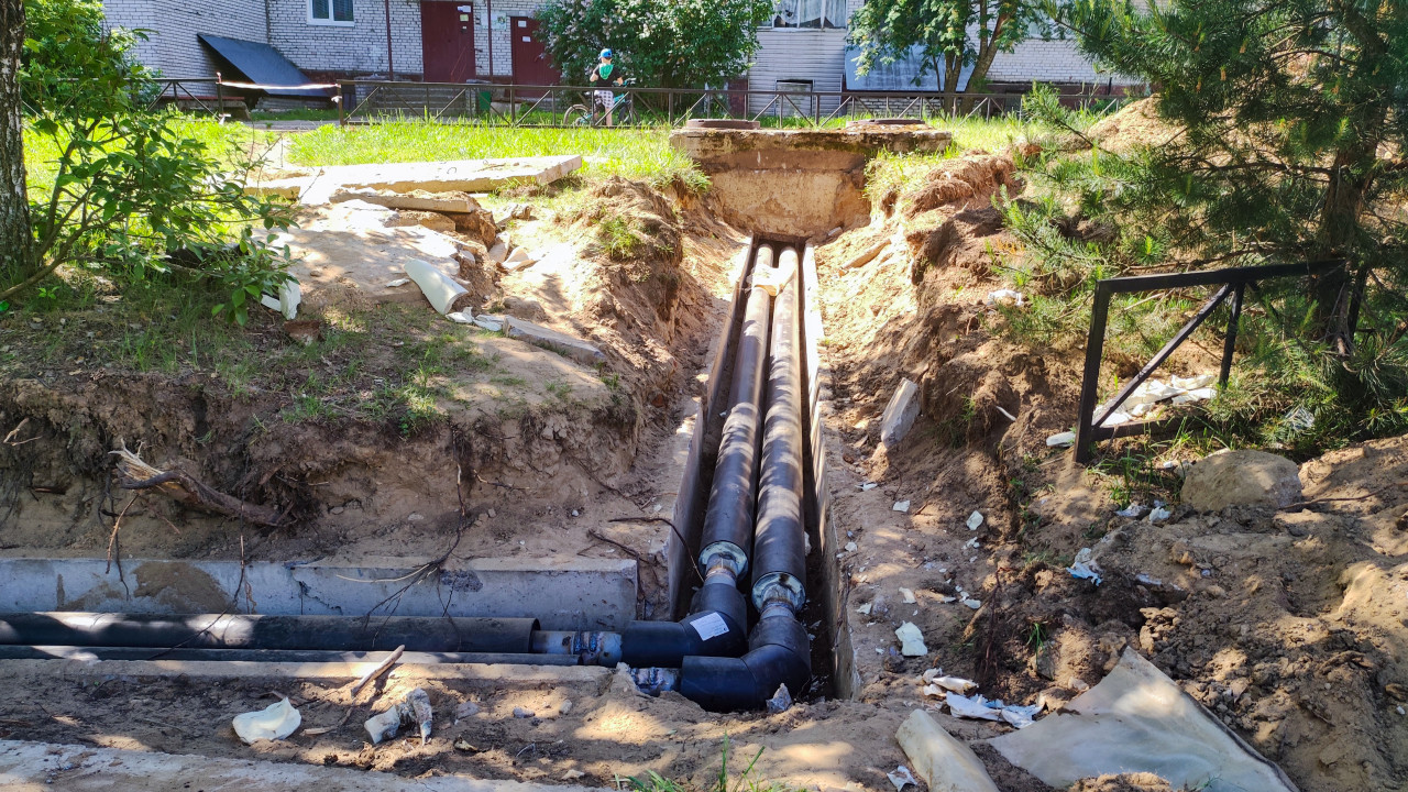 Траншея с теплоизолированными трубами в бетонном лотке во дворе жилого дома