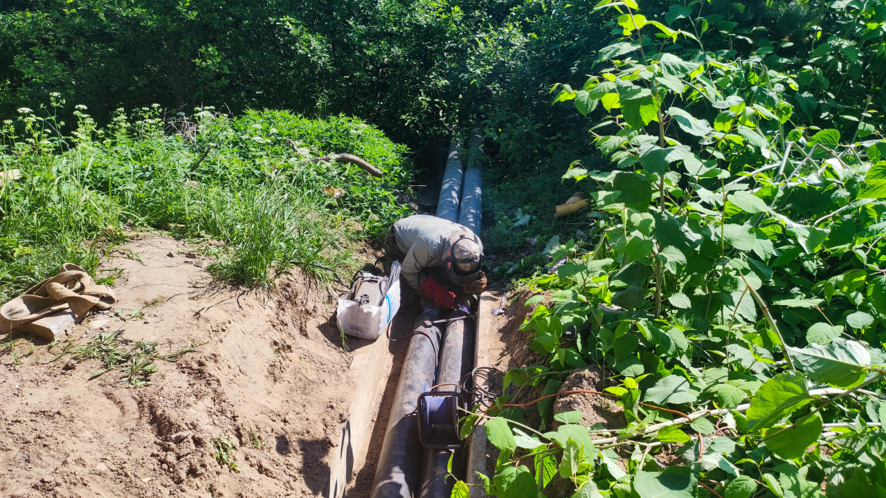 Съемка выполнена в солнечный летний день в заросшей зеленой зоне: в выкопанной траншее уложены две трубы, вдоль которых проложены кабели и провода, заметны соединения и крепления. Рабочий в защитной маске и плотных перчатках работает у стыка, рядом размещены сумка с оборудованием и упаковка, на откосе лежат ремни. Края траншеи сформированы песчаным грунтом, вокруг — густые кусты, деревья и высокая трава, часть труб уходит в тень под листвой. Фото подходит для материалов о ЖКХ, ремонте инженерных сетей, безопасности работ и обслуживании трубопроводов.