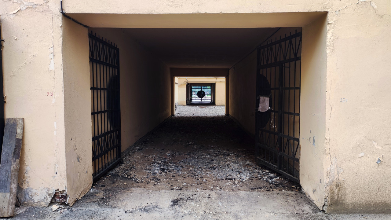 Вид из двора на сквозной арочный проход: стены со светлой штукатуркой образуют длинный тоннель, по бокам раскрыты металлические решётчатые створки ворот. На полу щебень и остатки старого покрытия, заметны потёртости и следы ремонта, вдоль стен идёт электрический кабель. В перспективе виден второй проём и ограждение, подчёркивающее глубину кадра. Освещение естественное, свет концентрируется в конце прохода. Снимок подойдёт для иллюстраций о городской среде, дворовых проездах, архитектурных деталях и вопросах безопасности.